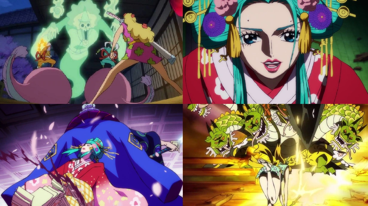 Nami e Shinobu osservano la scena dal sottotetto, ma Hanzo riconosce la kunoichi, che lo neutralizza con un colpo basso e fa marcire il legno sotto di loro, facendo crollare il sottotetto addosso a Orochi, che dunque lascia andare Komurasaki; Kyoshiro la ferisce mortalmente e raccoglie il volantino distribuito agli alleati della famiglia Kozuki che la ragazza aveva.