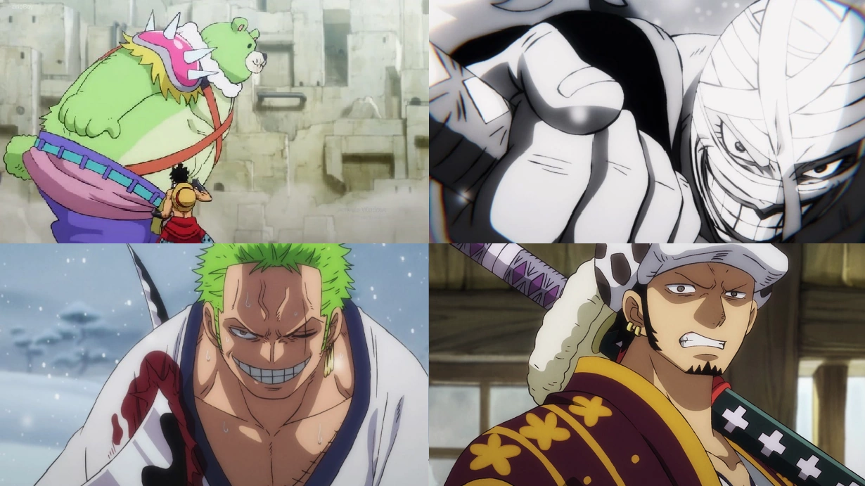 - Rufy affronta Bearman e Hyogoro gli dice di stare attento ai suoi artigli. Il Gifter non risente dei pugni di Cappello di paglia, finché quest'ultimo non ricorre all'Ambizione dell'armatura con cui riveste le mani, bloccando un colpo del nemico con una e sferrando un pugno con l'altra;