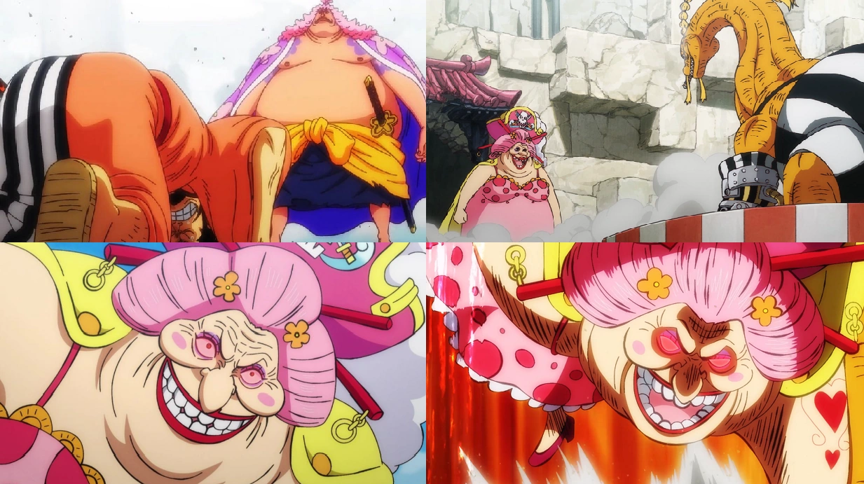 Intanto, a Udon, Big Mom entra nella prigione e tutti coloro al suo interno rimangono esterrefatti nel ritrovarsela davanti. L'imperatrice, sentendo profumo di zuppa di fagioli, chiama il resto del gruppo. Kiku chiede a Tama e Momonosuke di nascondersi, mentre entrerà con Chopper nella prigione. LinLin chiede di mangiare la zuppa, ma Queen afferma che non ne avrà affatto e si prepara a combattere, ma la donna lo attacca, schiacciandogli la testa al suolo.