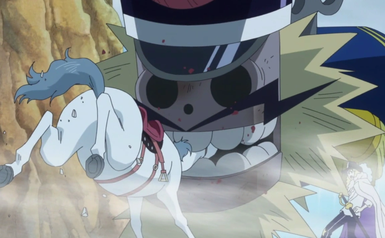 Sul nuovo altopiano reale, Cavendish, Rufy, Law e Kyros utilizzano Farul per aprirsi una strada verso la cima aiutati dai combattenti del colosseo delle corride, tuttavia al terzo livello vengono intercettati da giocattoli-schiaccianoci ed uno di loro azzanna alla testa Farul, quasi rompendogli il collo e facendolo crollare a terra.