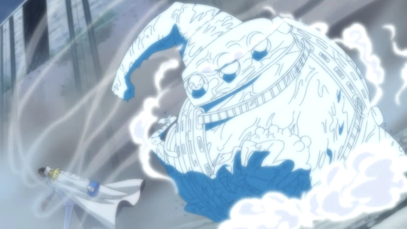 Poco dopo intercetta un fendente di Drakul Mihawk diretto verso Barbabianca e la Moby Dick. In seguito stacca un blocco di ghiaccio gigantesco e lo lancia contro la squadra dei giganti della Marina, ma il pezzo di ghiaccio viene fuso da Akainu grazie ai suoi poteri.