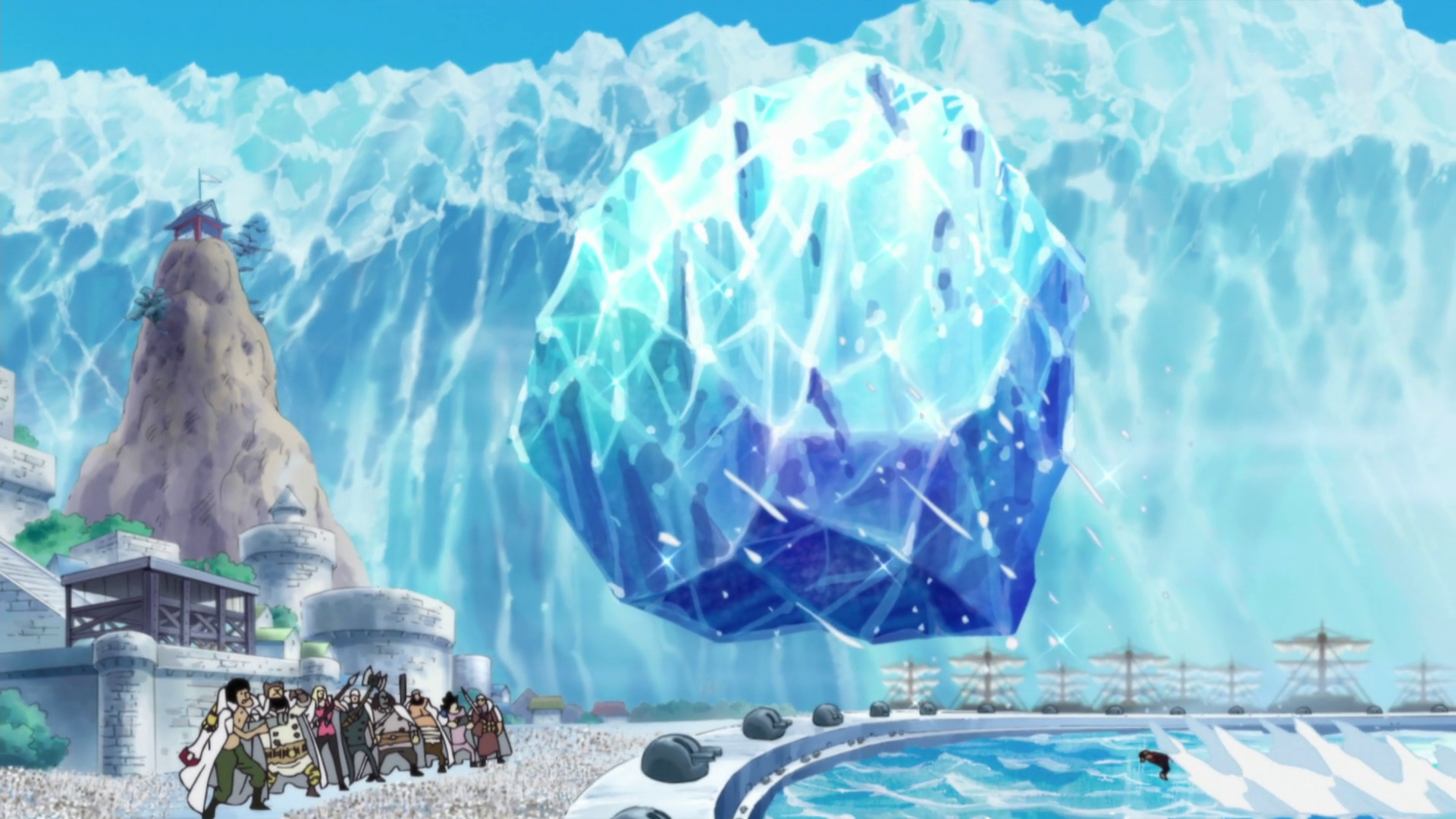 Jaws scaglia un enorme iceberg contro la squadra giganti della Marina.