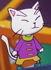 È un gatto con il pelo bianco e bipede. Indossa una maglia a maniche lunghe viola con il colletto giallo e tre righe orizzontali arancioni, pantaloncini arancioni e delle scarpe tecnologiche di colore verde acqua.