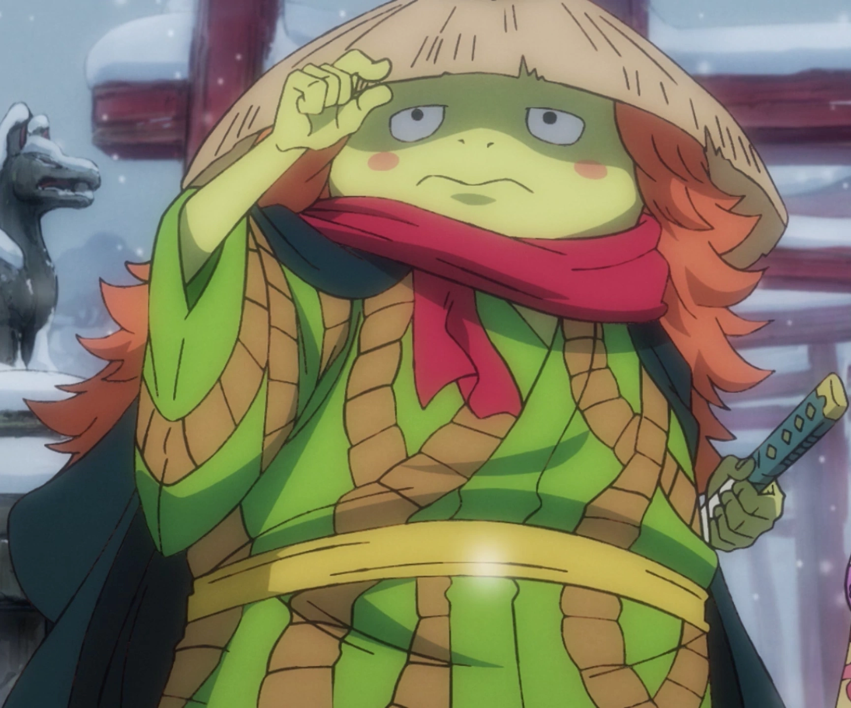 Il giorno seguente, raggiunge il ponte dei briganti, dove ferma il duello tra Zoro e Gyukimaru, venendo inoltre riconosciuto da Hiyori, che è felice di avere ritrovato. A quel punto alcuni uomini di Kaido raggiungono il ponte per recuperare le proprie armi rubate da Gyukimaru, sparandogli. Prima che possano continuare, però, Kawamatsu e Zoro li sconfiggono, mentre il monaco corre via.