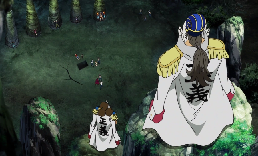 Rufy riesce a raggiungere per primo il punto centrale dell'isola, dove si trovano incatenati tutti i suoi compagni, ma all'improvviso cade in una botola sul cui fondo si trova acqua di mare. Rufy riesce ad aggrapparsi ad un bordo, ma Komei lo fa precipitare. Nami giunge in soccorso del suo capitano e il viceammiraglio prova a fermarla, ma la ragazza evita l'attacco e si tuffa nell'acqua. Quando Komei sta per colpire entrambi, appena riemersi, viene fermato da Foxy e Kansho. Non appena Rufy esce dall'acqua però, Kansho gli spara, seguendo gli ordini avuti in precedenza da Komei.