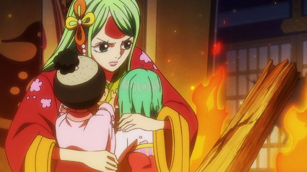 Yamato grida quindi a Momonosuke di sbrigarsi a creare nuvole di fiamme in grado di supportare Onigashima, che altrimenti cadrà a breve. Mentre la ragazza lo incoraggia, lui è nel panico perché non riesce a creare le nuvole di fiamme e ripensa alla notte in cui il castello di Kuri bruciò, domandandosi con quale coraggio si rivolse a sua madre quando la vide per l'ultima volta, ritrovando così sicurezza e tornando ad impegnarsi per trattenere l'isola, ormai prossima alla Capitale fiorita. Poco dopo Momonosuke rimane sbalordito quando Rufy lo chiama e gli chiede di spostare Onigashima, che gli è d'intralcio, perché sta per concludere il duello usando un pugno rivestito di Ambizione grande quanto l'isola stessa. Gli chiede quindi di fermarsi, ma il pirata replica che crede in lui, cosa che lo lo fa riflettere. Momonosuke pensa di non riuscire a spostare l'isola ma, ripensando alla sua famiglia, trova la giusta determinazione e prova a spingerla.
