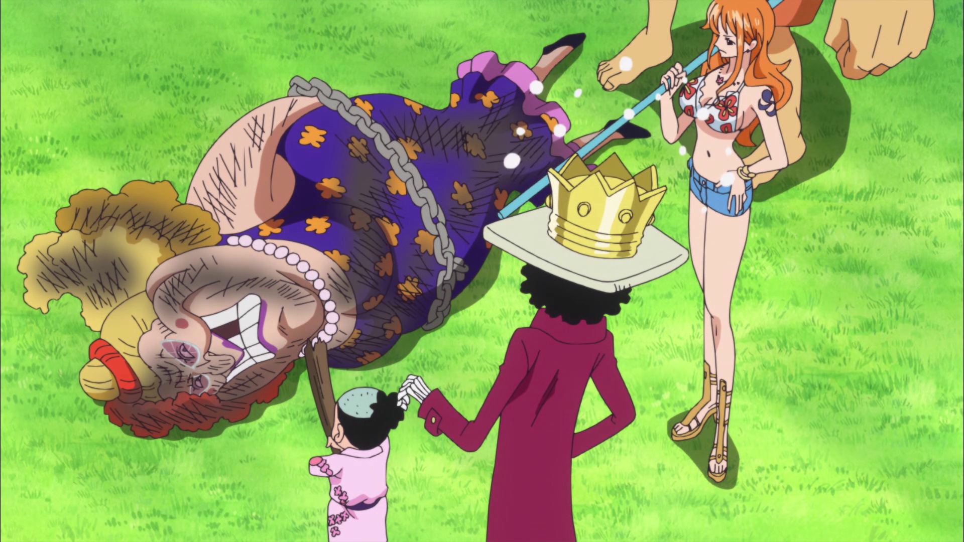 Momonosuke, Chopper, Kiku e Tama raggiungono la spiaggia di Kuri, dove si imbattono in Big Mom priva di conoscenza. Chopper va nel panico e consiglia al gruppo di fuggire; proprio in quel momento l'imperatrice si sveglia, ma senza memoria.