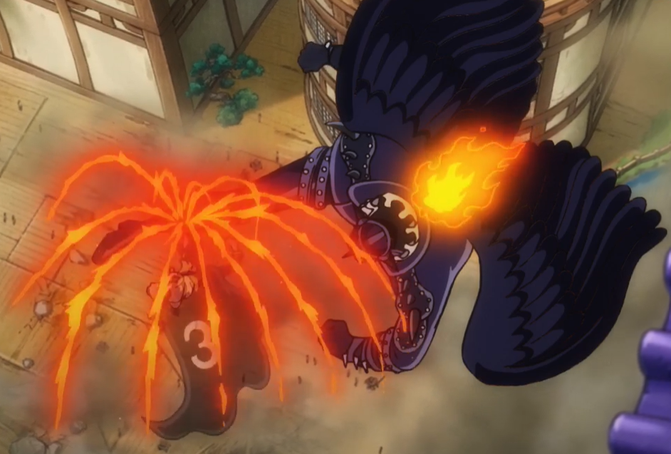 Mentre gli altri discutono sull'improvvisa comparsa di Kaido in forma di drago, Law spiega che l'imperatore potrebbe avere scoperto la loro presenza perché lui, Rufy e Zoro sono stati scoperti e che sia deciso ad eliminarli in seguito a ciò che hanno fatto per interrompere il suo commercio di Smile. Momonosuke vede Rufy dirigersi verso il quartiere degli scarti e Law inseguirlo, intimando agli altri di non farsi scoprire poiché Kaido ha avuto notizie solo di lui, Rufy e Zoro. Anche Kin'emon, però, insieme a Kiku, si affretta in direzione della cittadina dove abita sua moglie per assicurarsi che stia bene. Improvvisamente, Kaido vola verso le rovine e le distrugge. Shinobu allora fa sprofondare il suolo su cui si trovano così da evitare l'attacco, mentre Chopper usa il Guard Point per impedire che sprofondino insieme al terreno. Sanji porta poi in salvo le donne; quando anche gli altri vengono tirati fuori dal cratere così creato, Kiku rivela loro quanto accaduto.