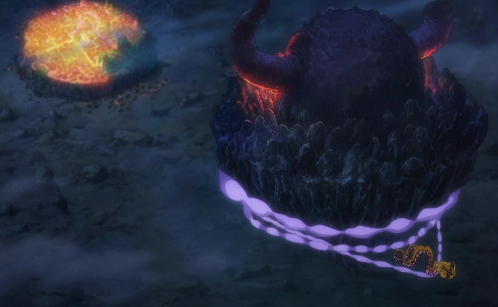 Quando Kaido spara un raggio energetico contro di loro, Rufy chiede a Momonosuke di fare lo stesso, ma quest'ultimo non sa come fare e si limita ad evitare il colpo, spiegando che non ne è in grado e che non pensava di combattere. Cappello di paglia allora gli suggerisce di mordere l'imperatore e poi salta verso il nemico, ma lui gli dice di fermarsi e che non può farlo, vedendo il ragazzo sbattere la testa del nemico a terra. Momonosuke ripensa alla notte dell'attacco al castello di Kuri e riesce a mordere il nemico, ferendolo e irritandolo. Yamato corre ad aiutarlo ma Rufy la precede e colpisce Kaido con un pugno, che poi si complimenta con lui. Cappello di paglia così lo incita facendogli notare che non dovrebbe più avere paura di volare poiché ha addirittura morso un imperatore e gli chiede di fermare l'avanzata dell'isola mentre lui affronterà Kaido, che sconfiggerà. Quest'ultimo torna in forma ibrida e gli chiede se crede davvero di potere vincere, così Rufy gli risponde che è ancora vivo e che nulla è impossibile. I due si scontrano: l'impatto dei loro colpi rivestiti con l'Ambizione del re conquistatore squarcia le nuvole nel cielo, fa tremare l'intera isola e crollare diversi massi.