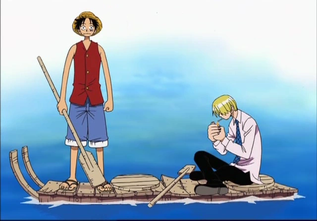Inizialmente viene spinta da Sanji con i remi, poi Rufy usa il suo potere per trasformare la testa e il collo in una specie di motore. Questo gli dona velocità, ma la zattera viene infine distrutta da una grossa onda nel tentativo di superare il lungo vortice.