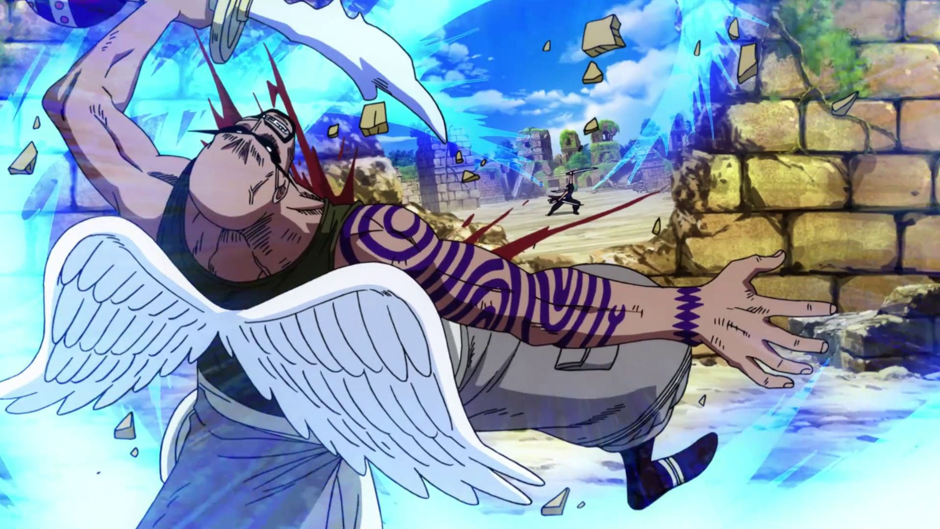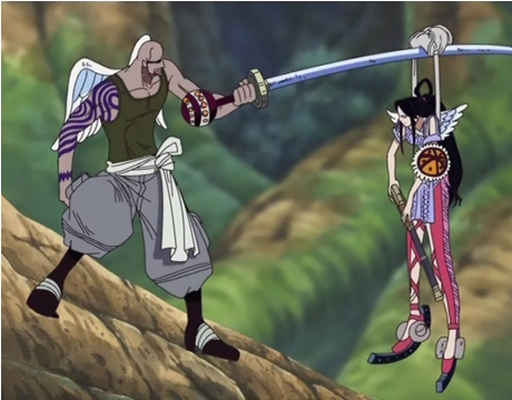 Vede a quel punto Wiper colpire un guerriero sacro e scagliarlo contro la gabbia, sconfiggendolo, commentando così che basta sfiorarlo per lasciarci le penne; Zoro allora si domanda qualora battesse gli altri da dove uscire. Ohm gli suggerisce di pensare prima a batterli.
