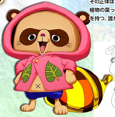 Per via del frutto del diavolo che ha ingerito, è un procione con il naso fucsia e dei segni intorno agli occhi. La sua coda è di notevoli dimensioni ed è a strisce dorate e marroni. Indossa una giacca con il cappuccio rosa e due foglie all'altezza del petto. Porta anche dei pantaloncini blu.