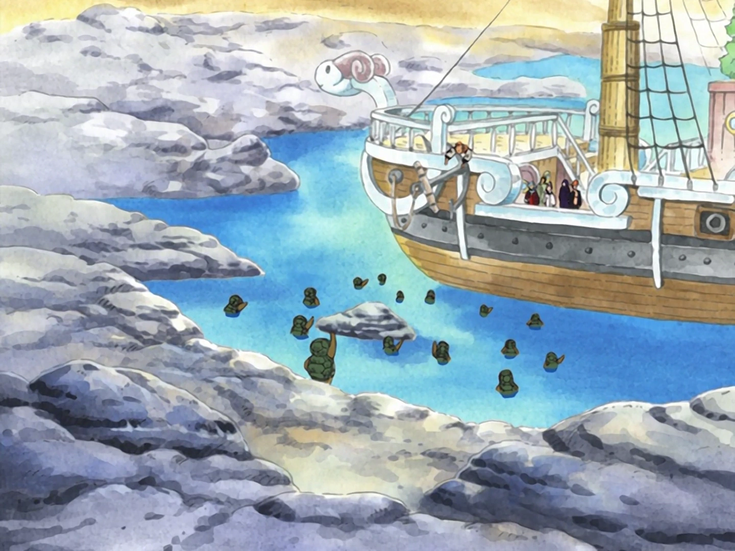 La Going Merry nel fiume Sandora, circondata dai dugonghi kung-fu.