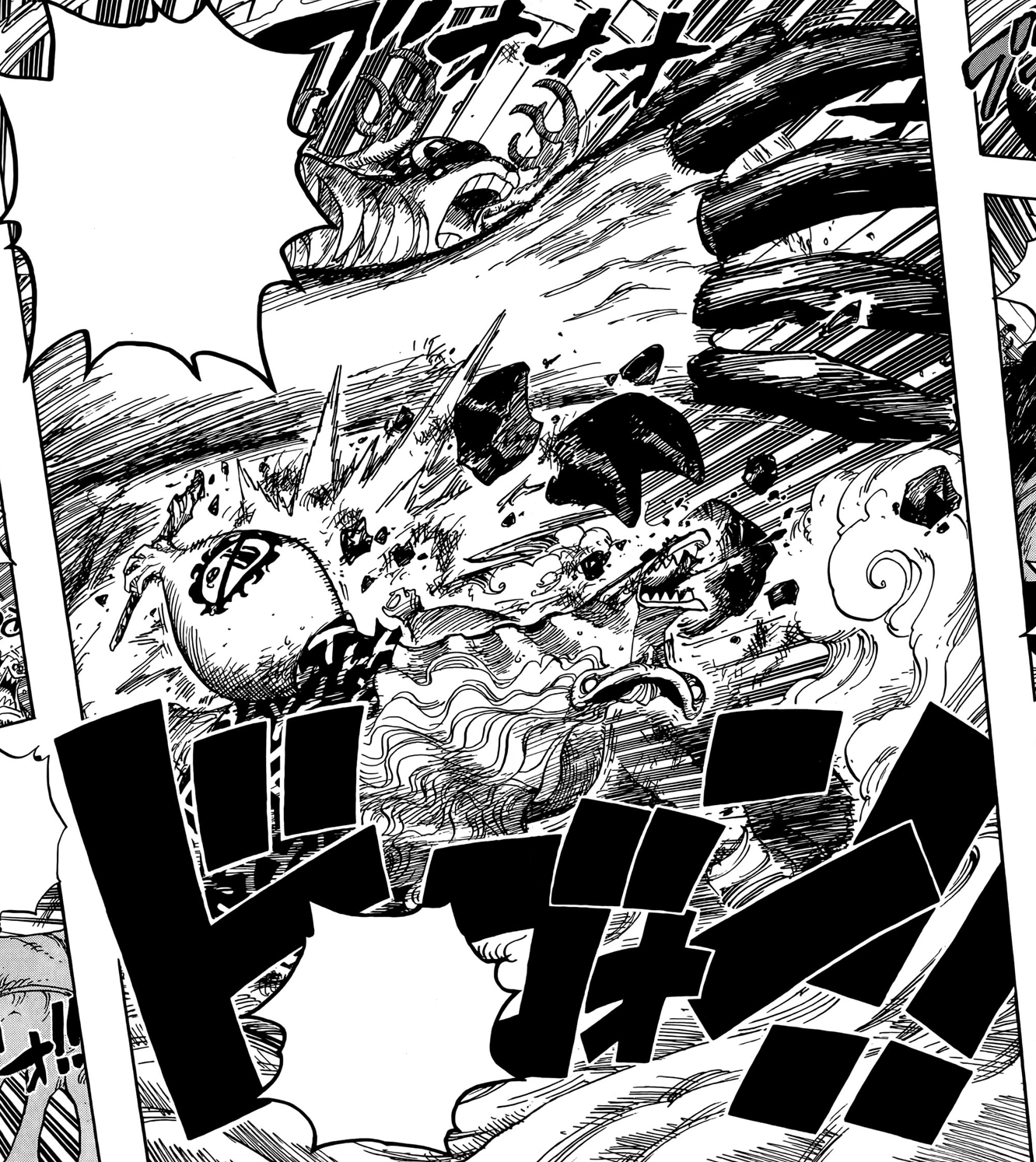 Rufy inizia a dirigersi verso Hody Jones per colpirlo senza pietà; Sbam gli si para subito davanti per fermarlo, ma Zoro interviene improvvisamente e blocca il suo attacco, facendolo cadere a terra.