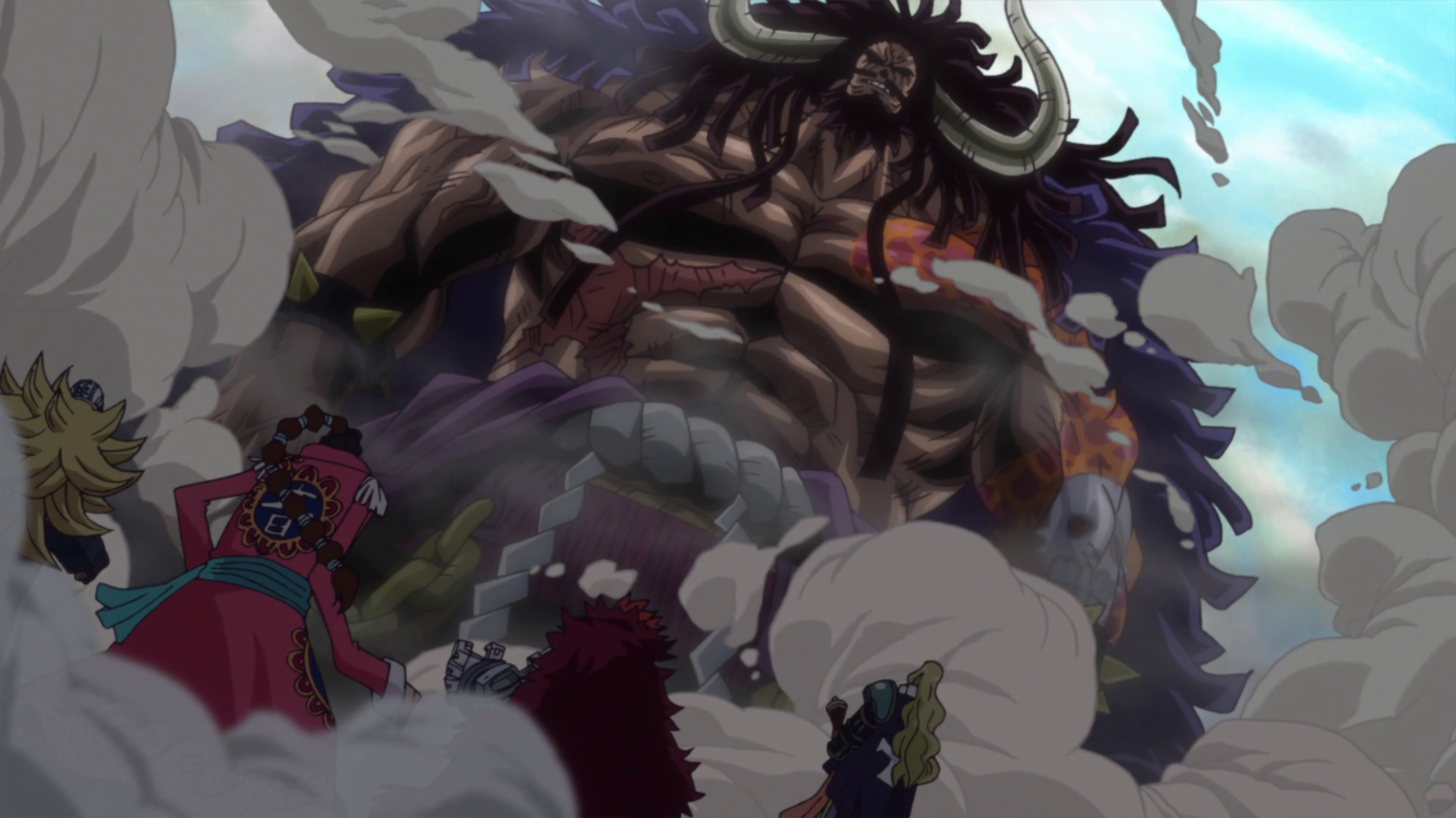 Poco dopo un'esplosione distrugge alcune navi e, quando i tre capitani e le loro ciurme vanno a verificare, si ritrovano davanti proprio Kaido.[22] Apoo rivela così di essere già un subordinato dell'imperatore. Vede poi Hawkins sottomettersi a quest'ultimo mentre Kidd e Killer si rifiutano, venendo sconfitti.