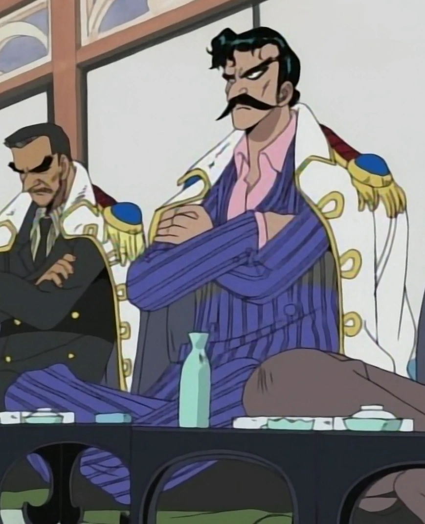 Indossa sempre la classica giacca degli ufficiali di alto rango della Marina appoggiata sulle spalle. Durante la discussione su Rufy e sul successore di Crocodile, ha indossato un completo viola a strisce verticali nere, mentre a Marineford portava un abito a strisce gialle con sotto una camicia bordeaux e una cravatta arancione.