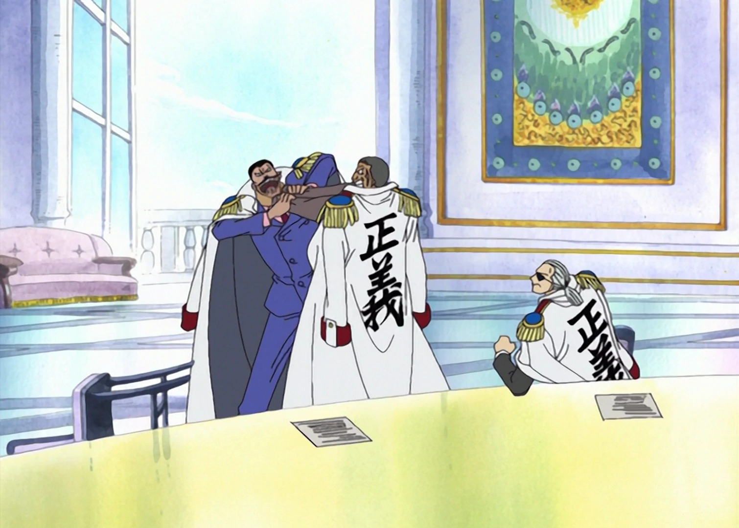 Ascolta poi il battibecco tra i due ed è subito dopo testimone dell'arrivo di Drakul Mihawk. A quel punto un uomo chiede di partecipare alla riunione, che Tsuru riconosce essere Lafitte, del quale rivela il passato. Quest'ultimo propone così il suo capitano Teach per occupare il posto vacante nella Flotta dei sette, rivelando che la sua ciurma, di cui fa il nome, ha un piano ben preciso per farsi conoscere, ma ha bisogno di ancora un po' di tempo.