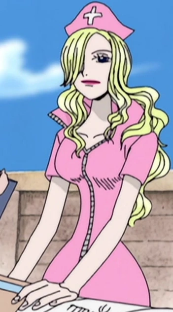 È una giovane donna con lunghi capelli biondi e la frangetta che le copre l'occhio destro. Indossa un'uniforme rosa da infermiera, il rossetto fucsia e delle calze a macchia di leopardo.