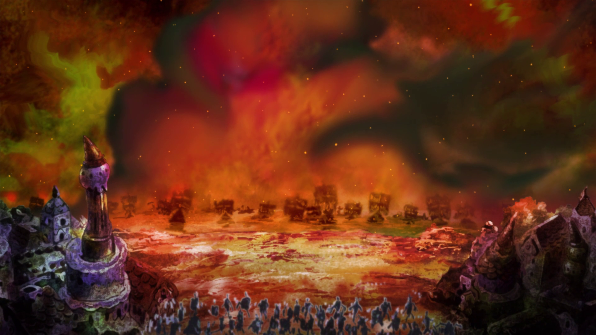 Gli abitanti dell'arcipelago vengono a sapere di ciò che sta accadendo a Cacao e che i Pirati Firetank e Big Mom hanno raggiunto Funwari, dove quest'ultima sta per cibarsi della torta nuziale. Quando giunge la notizia che, mangiando il dolce, l'imperatrice si è calmata, tutti gli abitanti dell'arcipelago esultano. Nel frattempo, la flotta di Smoothie circonda la Thousand Sunny, ma in soccorso dell'equipaggio intervengono prima Vinsmoke Judge e poi i Pirati del Sole. Tuttavia, in poco tempo la situazione si ribalta: il Germa 66 sembra avere la peggio su Cacao, Oven fa bollire il mare attaccando tutti coloro che vi sono immersi e la nave dei Pirati del Sole viene colpita dalla Queen Mama Chanter. Tuttavia, la ciurma di Aladin va al contrattacco per permettere alla Sunny di fuggire. Poco dopo giunge la notizia che quest'ultima è uscita dalle acque di Tottoland.