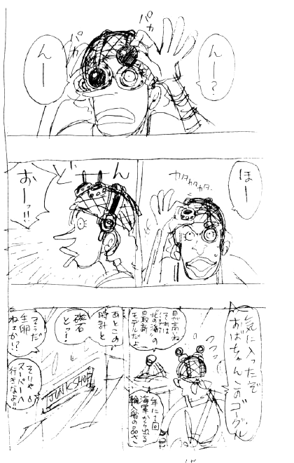 O: Sono degli occhiali, occhiali da cecchino. All'inizio li ha indossati solo per l'aspetto, ma a Rogue Town ha comprato l'ultimo modello dal mare settentrionale. La scena a destra doveva essere la prima pagina del capitolo 98 del volume 11, ma avevamo raggiunto il limite di pagine per cui l'abbiamo scartata. Gli occhiali hanno anche delle protezioni solari per non abbagliarsi quando si prende la mira, si possono alzare, girare e cose simili e per questo piacciono molto ad Usop.