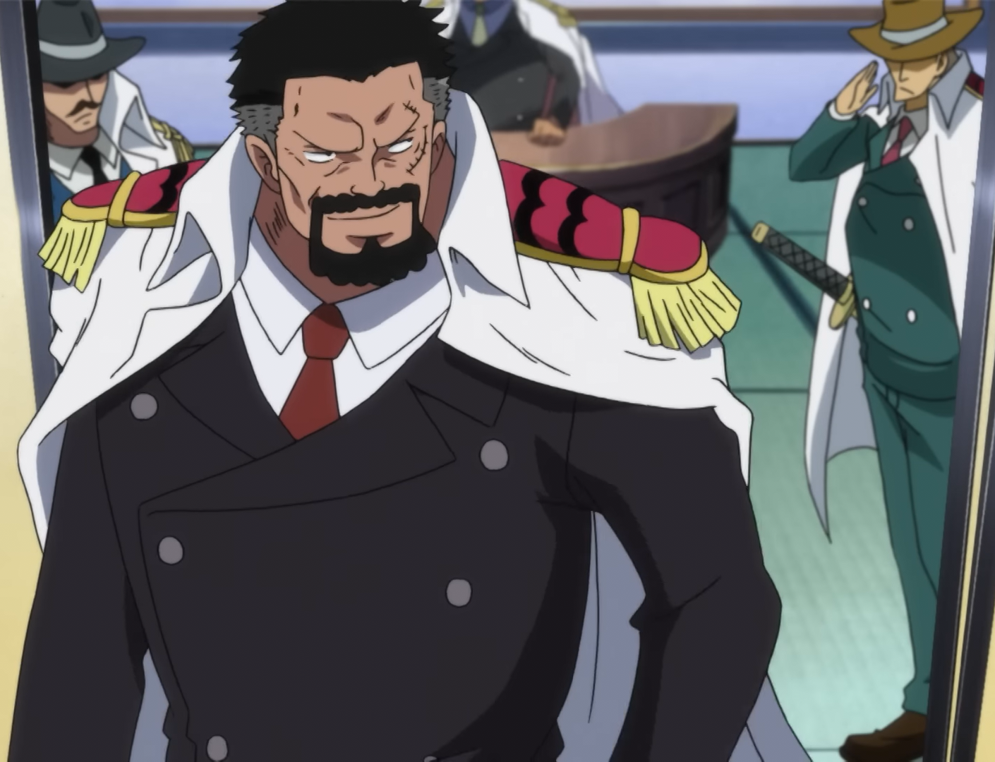 Jest wiernym marynarzem Garpa, można go zobaczyć kilka razy w serii u boku wiceadmirał, Jest kompletną przeciwnością swojego przełożonego, odzywa się tylko jeżeli jest to konieczne.