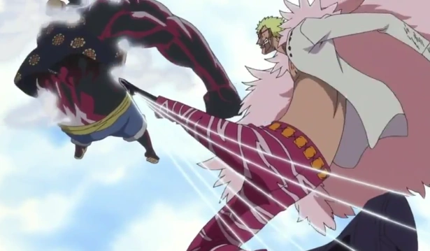 Wzmocniona dominacją noga Doflamingo odbija się od Luffy'ego.