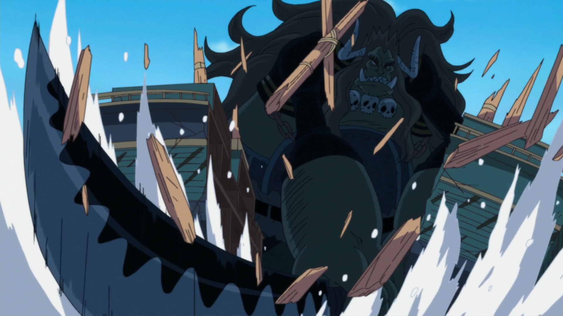 Little Oars Junior niszczy okręt wojenny wielkim mieczem.