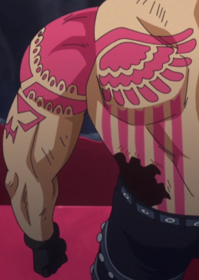 - ↑ 53,0 53,1 53,2 One Piece Mangá e Anime — Vol. 86 Capítulo 868 (p. 15-17) e Episódios 838–839, Bege se transforma no Big Father.