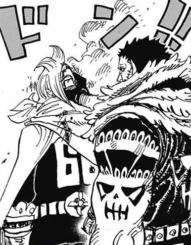 - ↑ 38,0 38,1 One Piece Mangá e Anime — Vol. 88 Capítulo 880 (p. 10-13, 15-17) e Episódios 852–853, Katakuri protege seus irmãos.