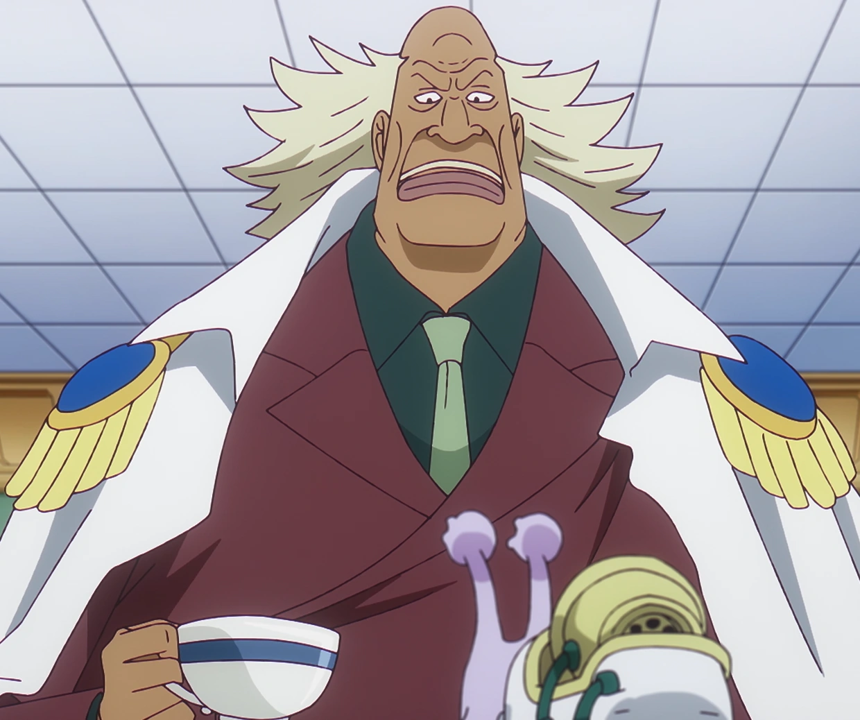 Ele foi visto segurando duas katanas em seu quadril direito. Mais tarde, ele foi visto com seus companheiros vice-almirantes alinhados e prontos para lutar contra os Piratas do Barba Branca.