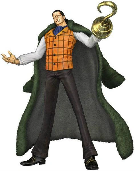 Depois que ele foi encarcerado em Impel Down, ele usava um uniforme de prisioneiro listrado, como a maioria dos outros prisioneiros, mas foi de alguma forma permitido manter seu gancho de ouro.[23] Depois de se juntar a Luffy e Jinbe em sua missão para salvar Ace, ele obteve uma troca completa de roupas dos suprimentos da Newkama Land e depois usou uma camisa preta, um lenço verde, calça cinza escuro e um sobretudo preto com marrom (cores claras no anime) de guarnição de pele.[24] Após a Batalha de Marineford, ele é visto em trajes muito semelhantes ao de Alabasta, consistindo de um colete sobre uma camisa simples, um cachecol em volta do pescoço, calças de terno, sapatos elegantes e um casaco de pele ao redor de seus ombros.[18]