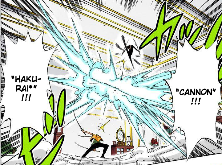 - ↑ One Piece Mangá e Anime — Vol. 42 Capítulo 401 (p. 7-8) e Episódio 286, Zoro usa Nanajuni Pound Ho contra o Rankyaku de Kaku: Hakurai.