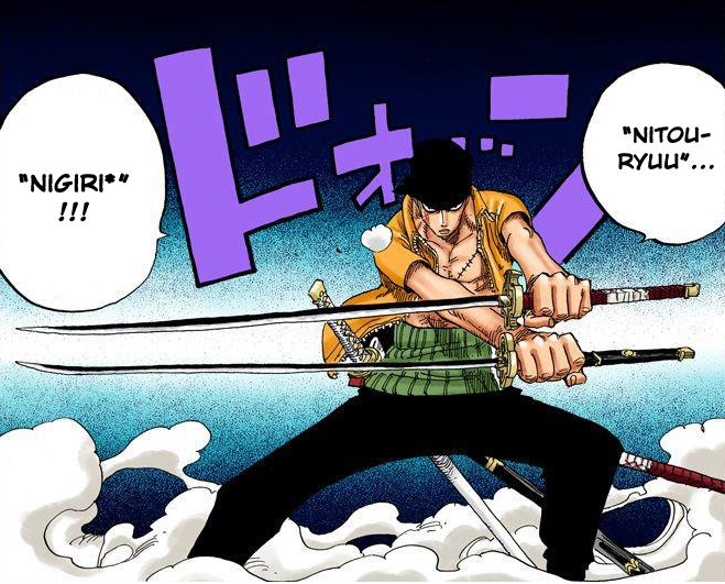 - Nigiri (弐斬り, Nigiri?, literalmente significa "Dois Cortes"): Zoro deixa duas espadas retas para a direita em horizontal e sem seguida ataca com um movimento vertical. Este movimento é como um pré-requisito para executar: Toro, Otoro, Hirameki, Samon,[5] e Maguma. [6]