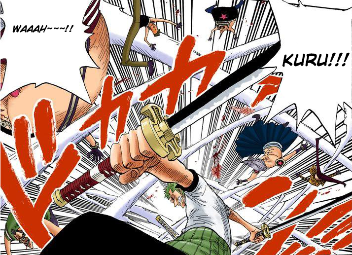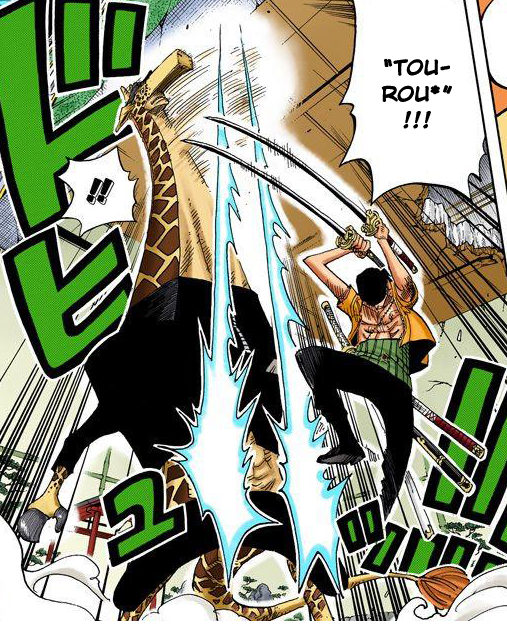 - ↑ One Piece Mangá e Anime — Vol. 34 Capítulo 325 (p. 4-5) e Episódio 231, Zoro usa Sai Kuru.