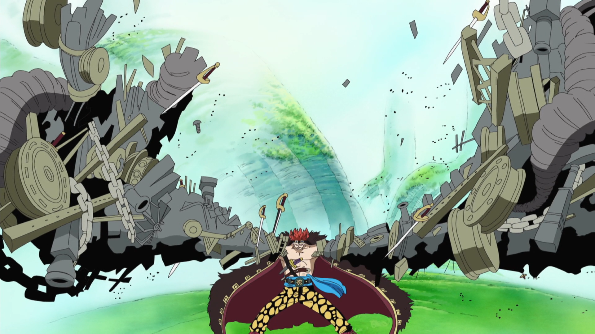 ↑One Piece Mangá e Anime — Vol. 102Capítulo 1029 (p. 5-17) e Episódio 1054, O novo braço de Kid é cortado através do redirecionamento de dano da Wara Wara no Mi.
