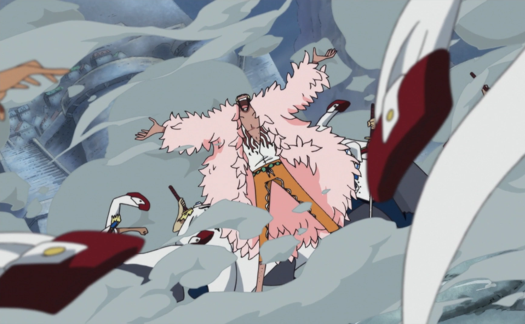 - ↑ One Piece Mangá e Anime — Vol. 79 Capítulo 792 (p. 8-9) e Episódio 735, Doflamingo é capturado.