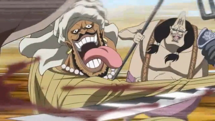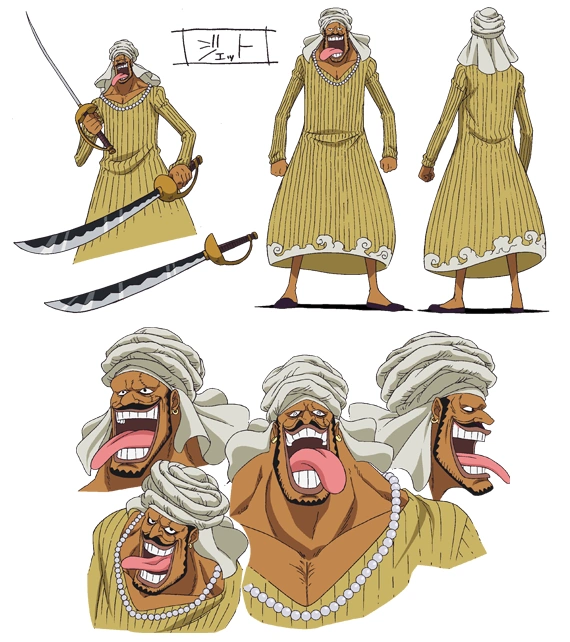 Впервые они появляются, когда Дагама рассказывает об истинных намерениях конкурентов в борьбе за Дьявольский плод. Абдулла показан спокойным и угрюмым, а Джет нетерпеливым и облизывающим одну из своих сабель.[1]