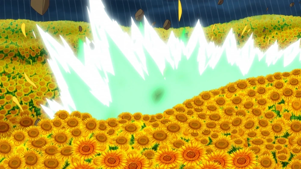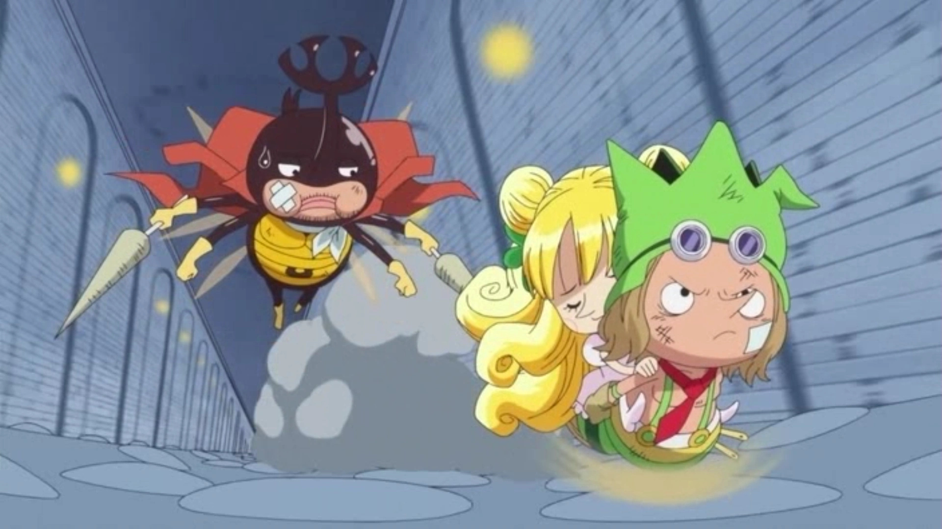 В другой части острова, Санджи сражается с агентами, пытающихся подстрелить их с крыши, но терпят поражение из-за его быстрых ударов. После чего Санджи, с большой улыбкой выражает свою любовь к Виолетте.[10]