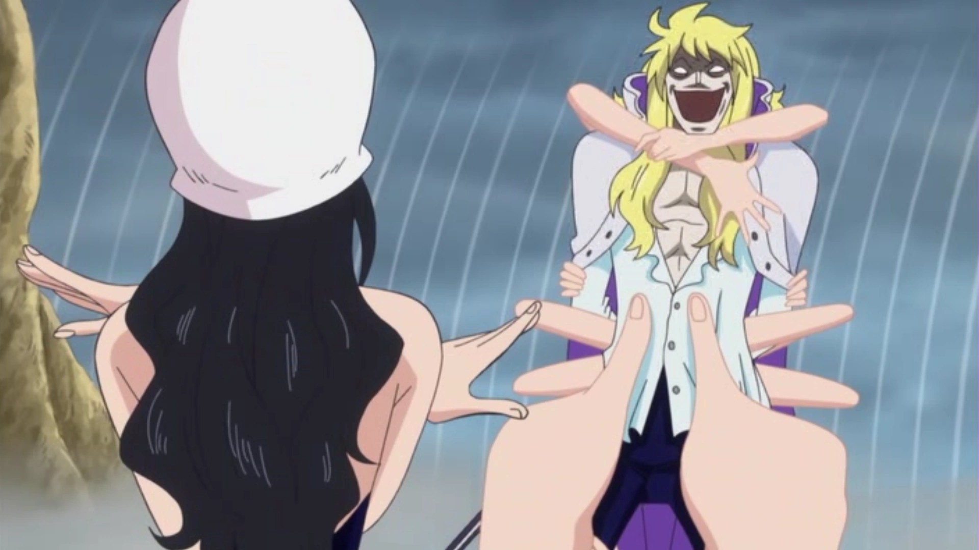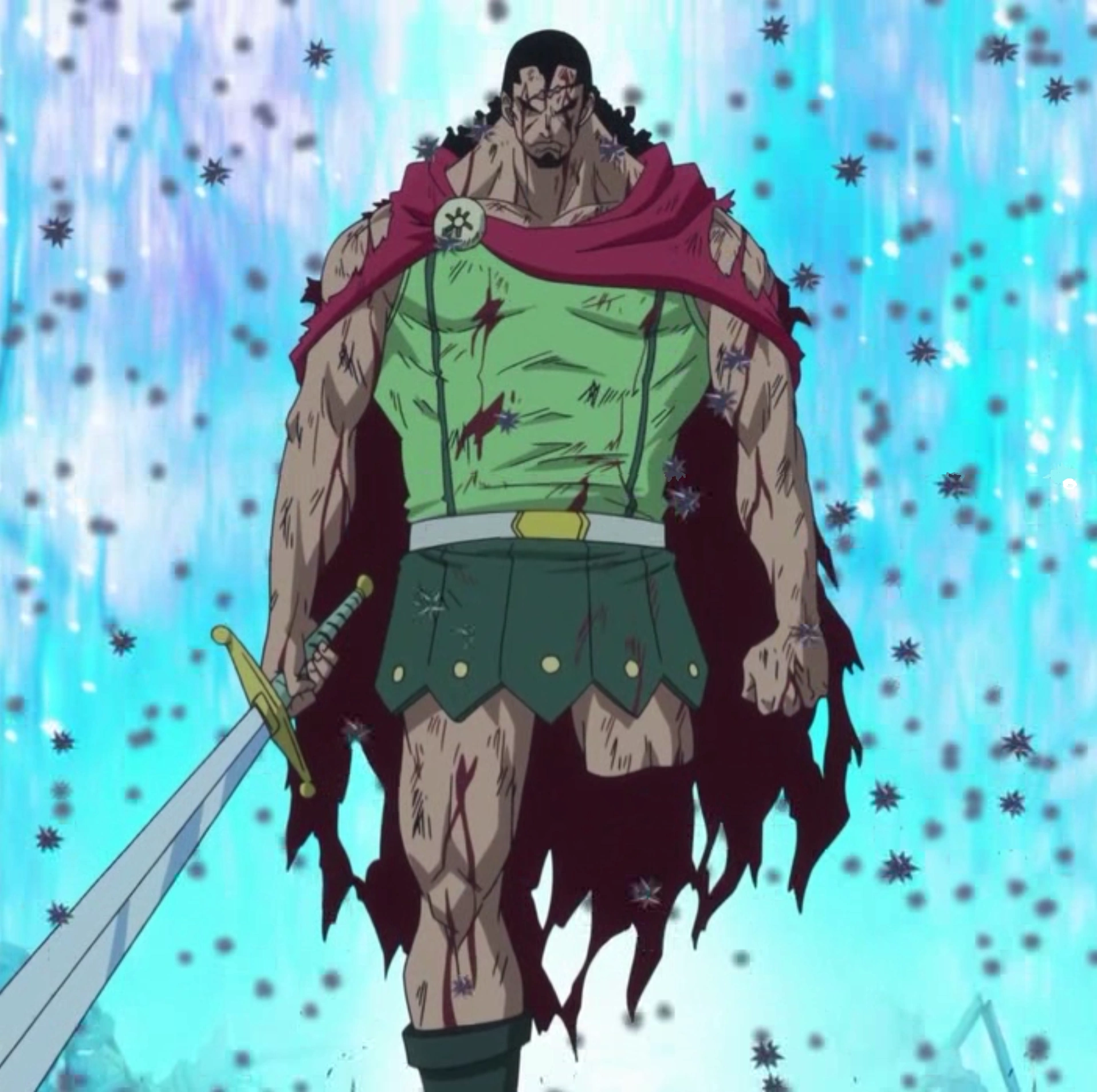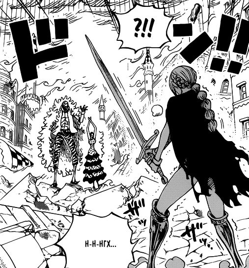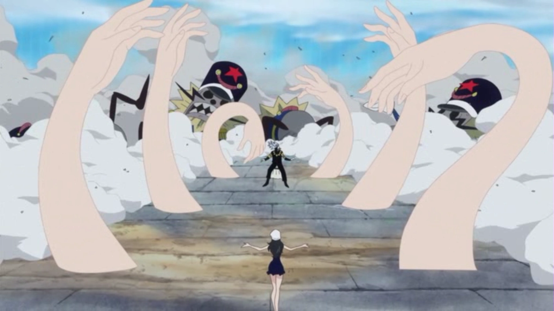 Однако слепец сказал Луффи сделать шаг назад, после чего обнажил свой меч. Внезапно дилеров начинает сильно придавливать к земле, вместе с ними начинает обрушиваться пол, создавая гигантскую дыру куда в дальнейшем все они упали. Луффи и его группа были восхищены силой этого человека, слепец отмечает, что быть слепым не так уж плохо, так как можно не видеть "грязи" окружающего мира.[2]