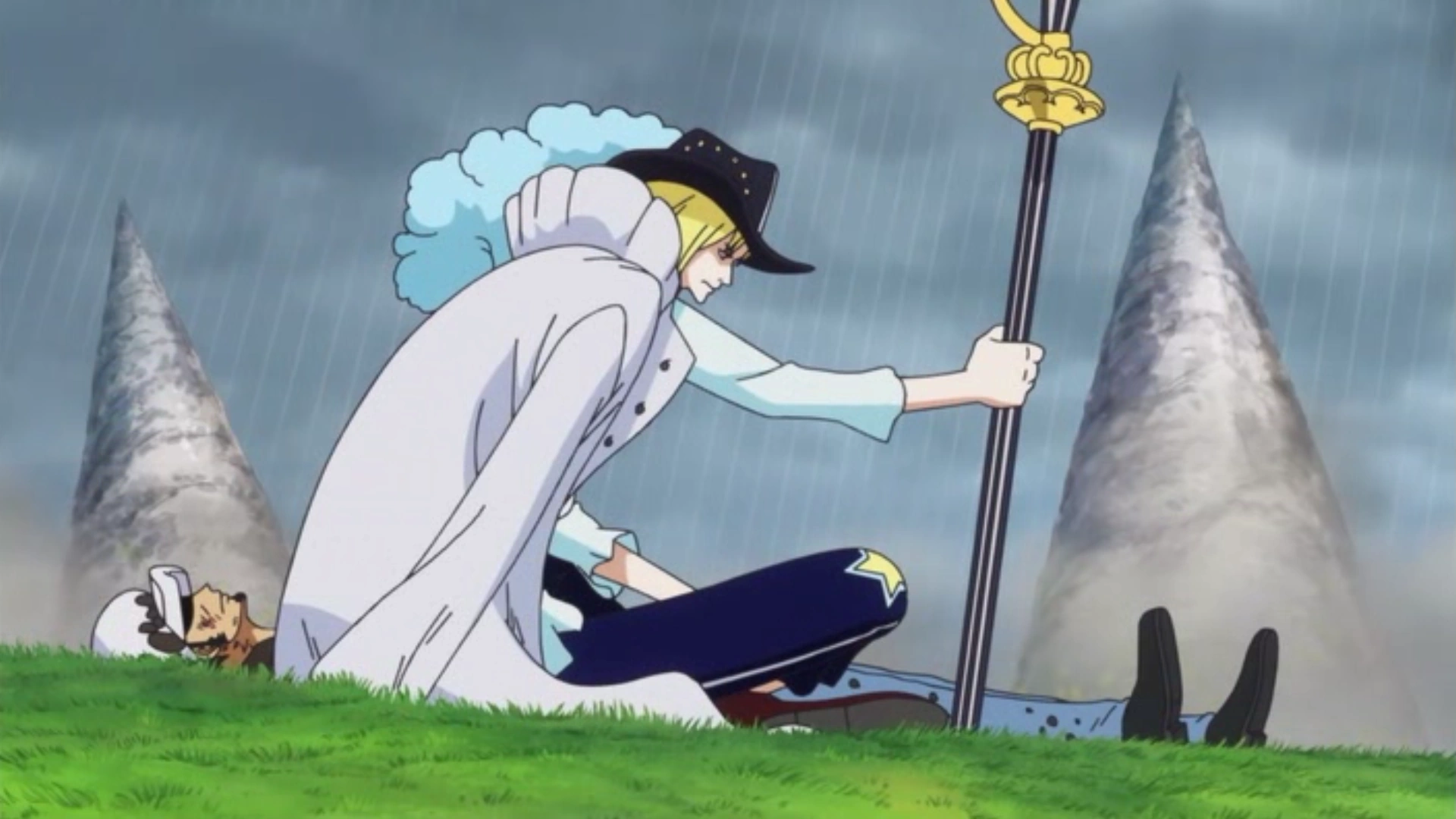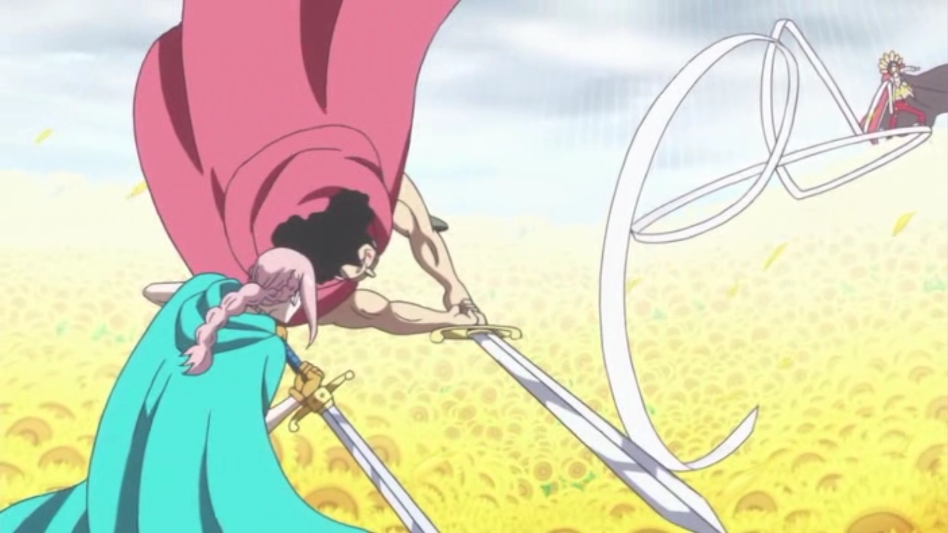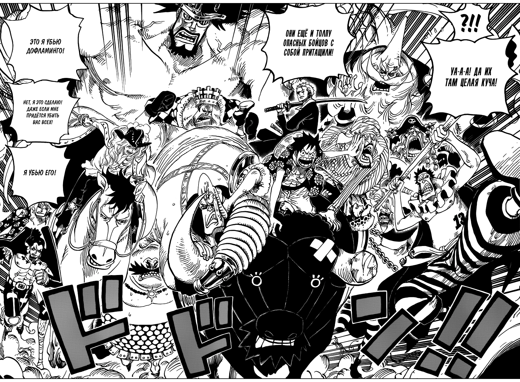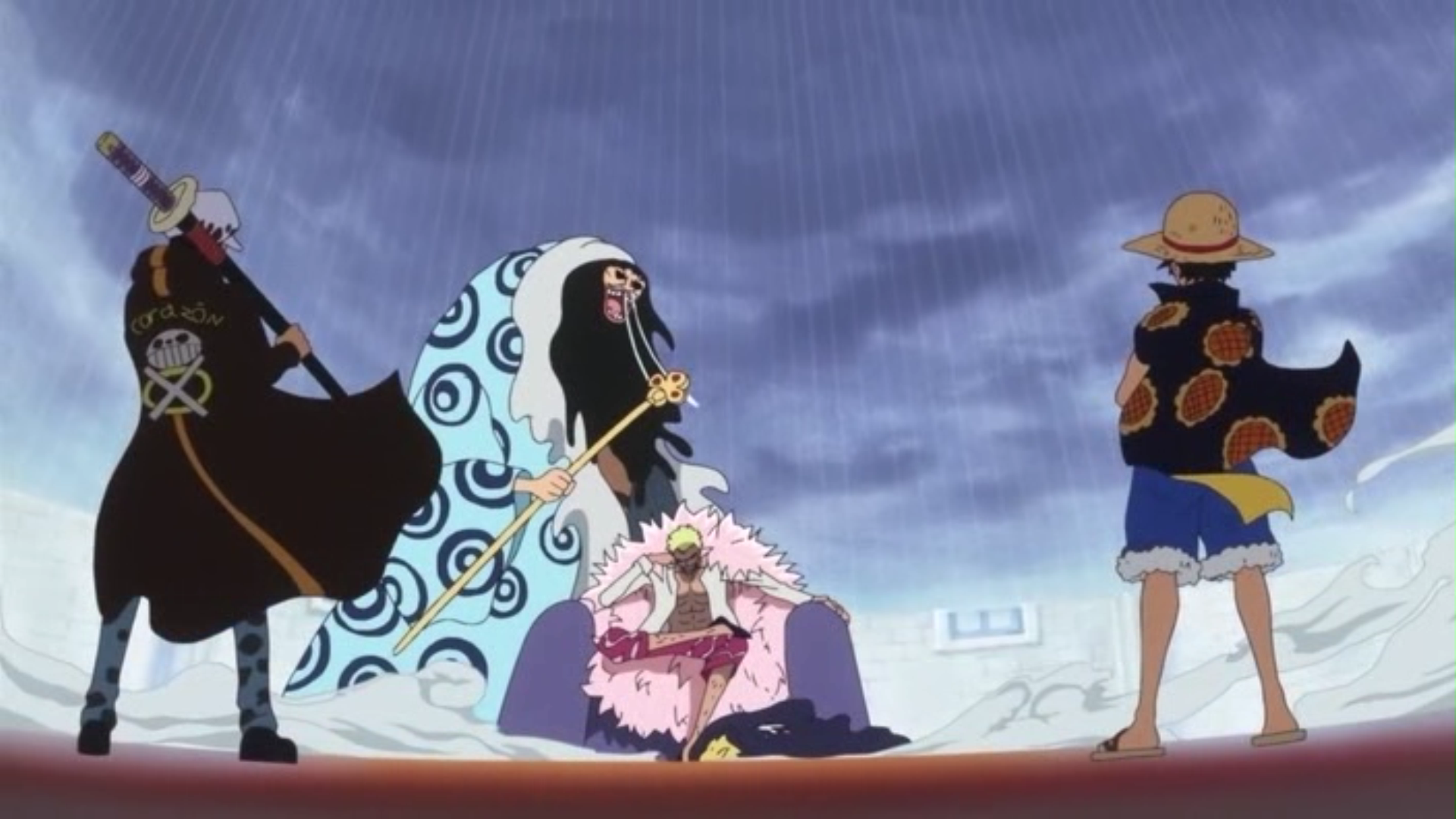 После окончания речи Дофламинго, Луффи связывается с Робин и Ребеккой, которой обещает победить Дофламинго. Тогда, не смотря на несогласие Трафальгара Ло, Мугивара Луффи хватает его и Зоро, после чего спрыгивает с Королевского Плато, приказывая Дофламинго ждать его.[25]