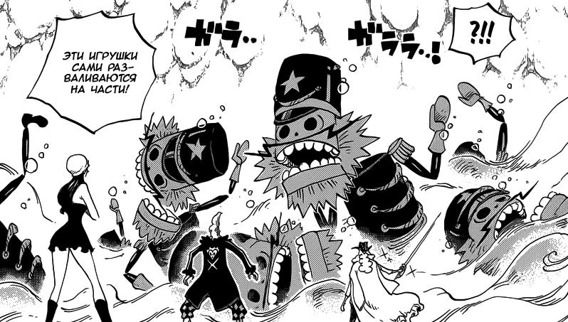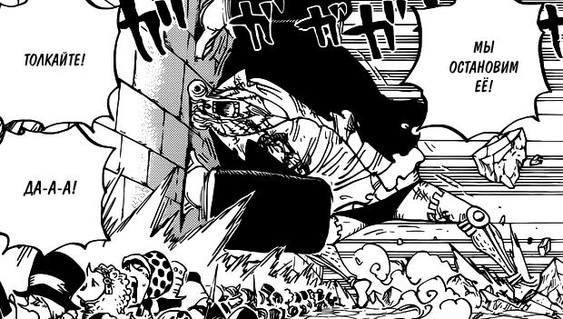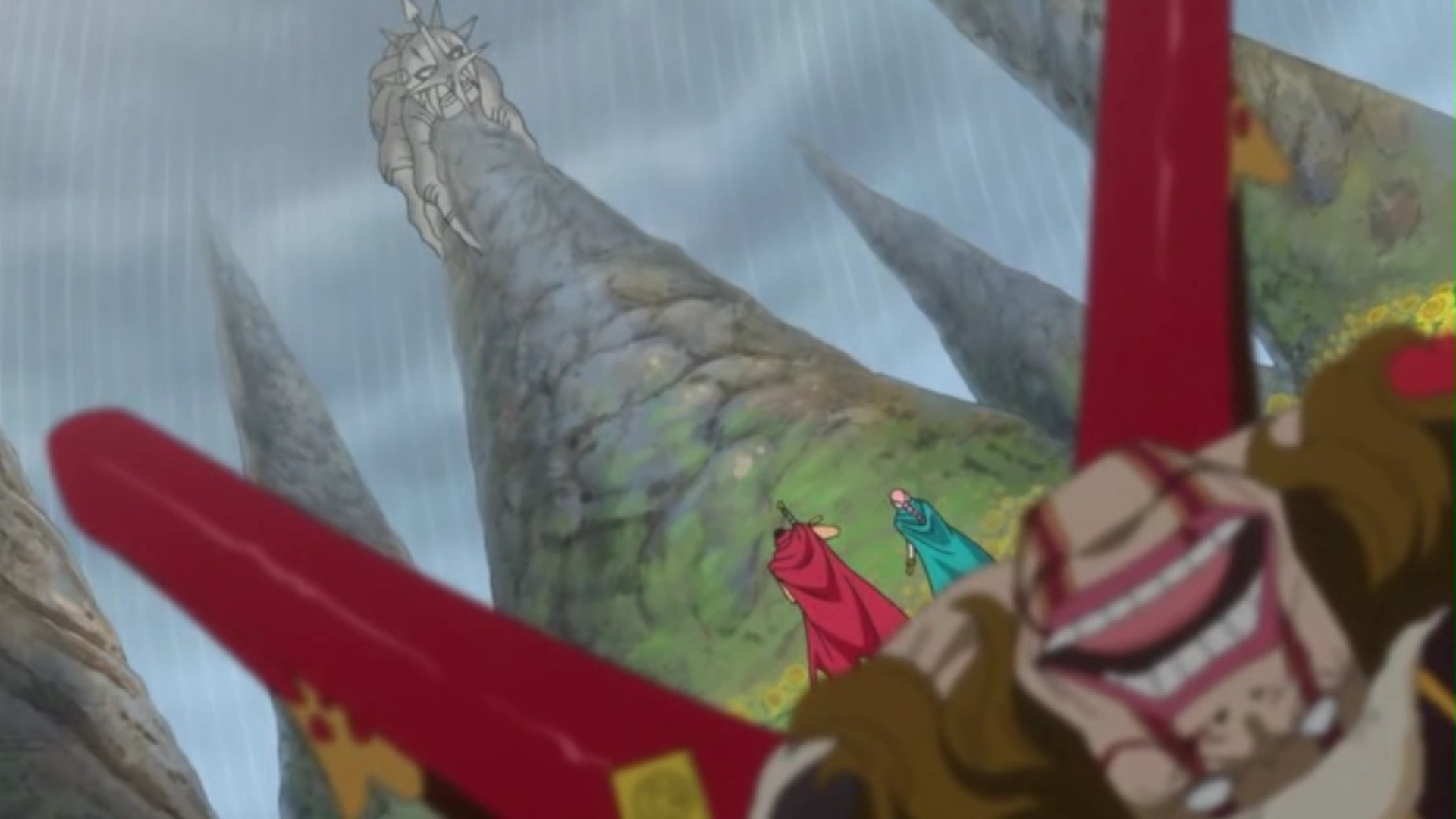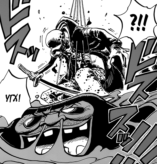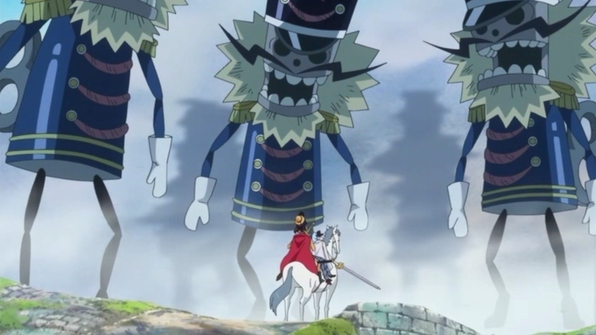 В другом месте, Зоро тащат через крышу, при этом он не отпускает свой меч. В итоге упав с крыши на землю, что-то падает на него вместе с ним. Таинственный голос, говорит, что его не должен заметить человек, однако Зоро всё же увидел что-то, что заставило его впасть в шок.[10]