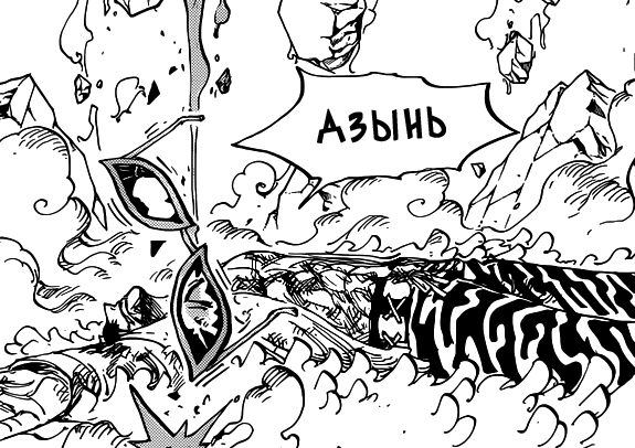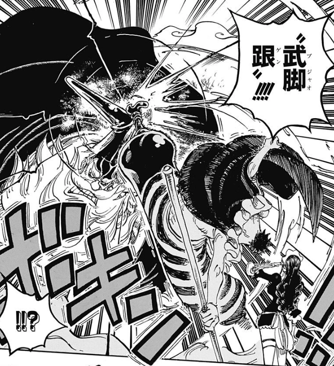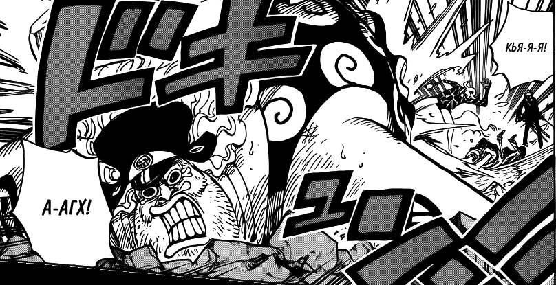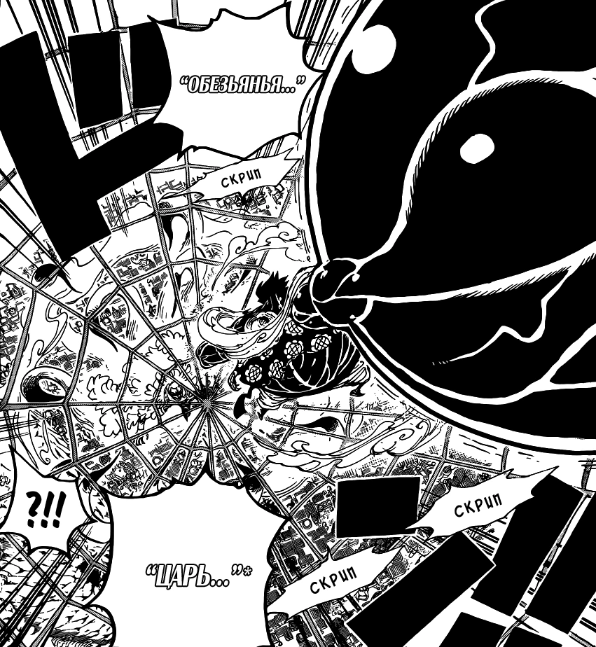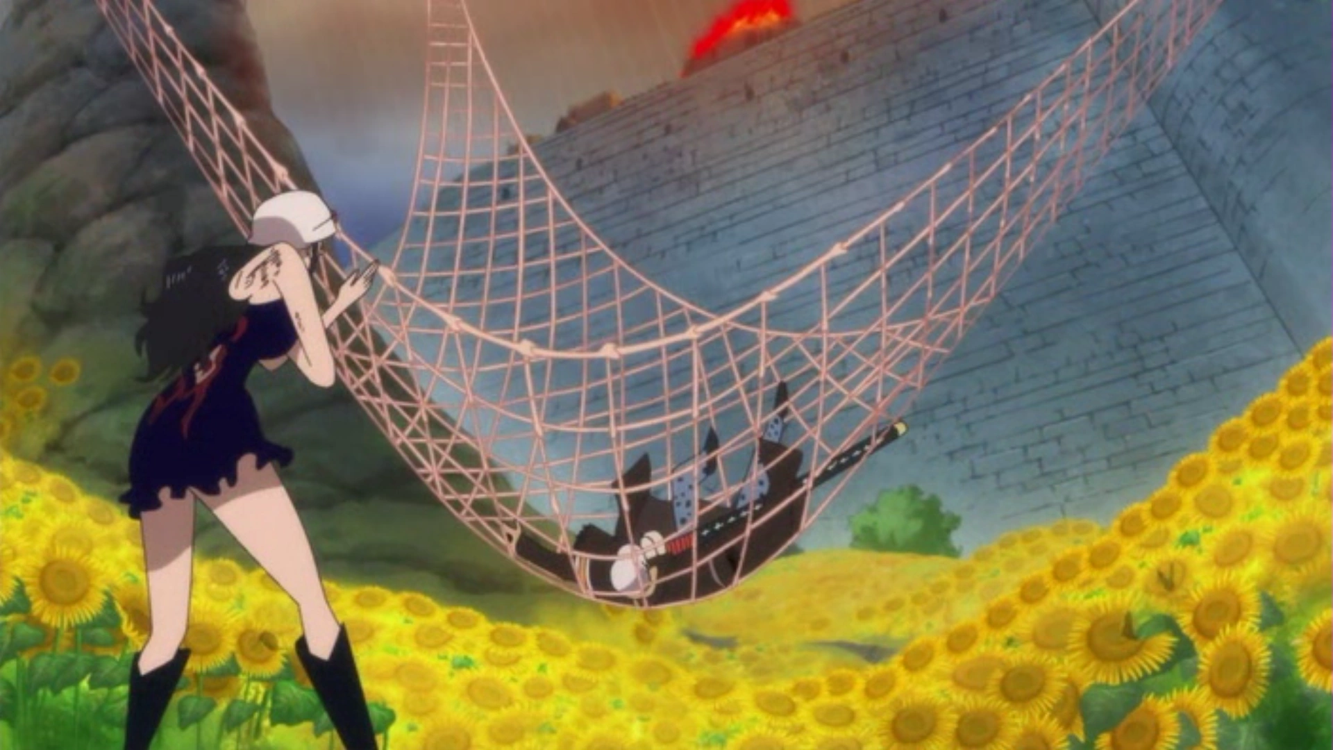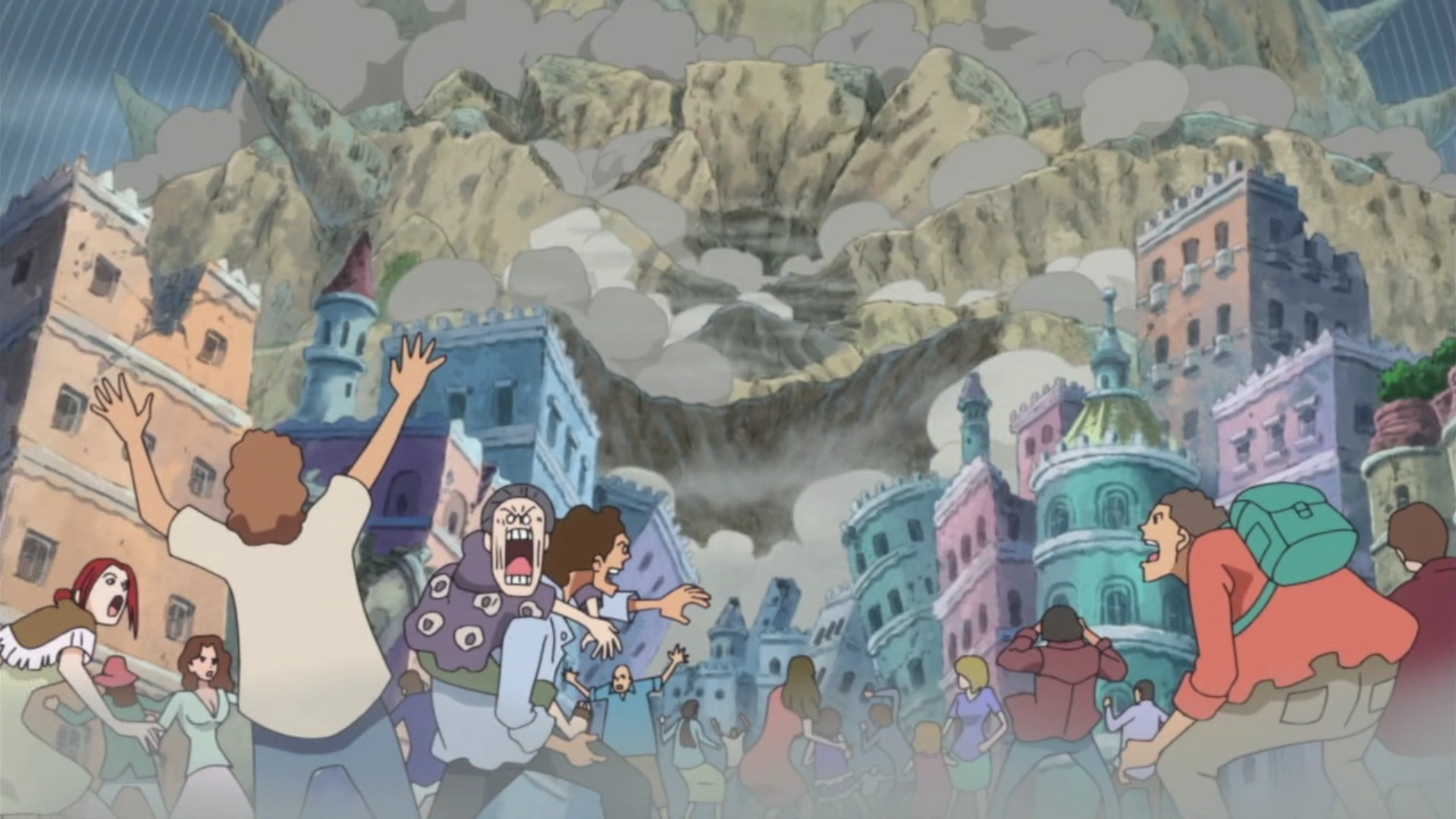 В другом месте, Зоро тащат через крышу, при этом он не отпускает свой меч. В итоге упав с крыши на землю, что-то падает на него вместе с ним. Таинственный голос, говорит, что его не должен заметить человек, однако Зоро всё же увидел что-то, что заставило его впасть в шок.[10]