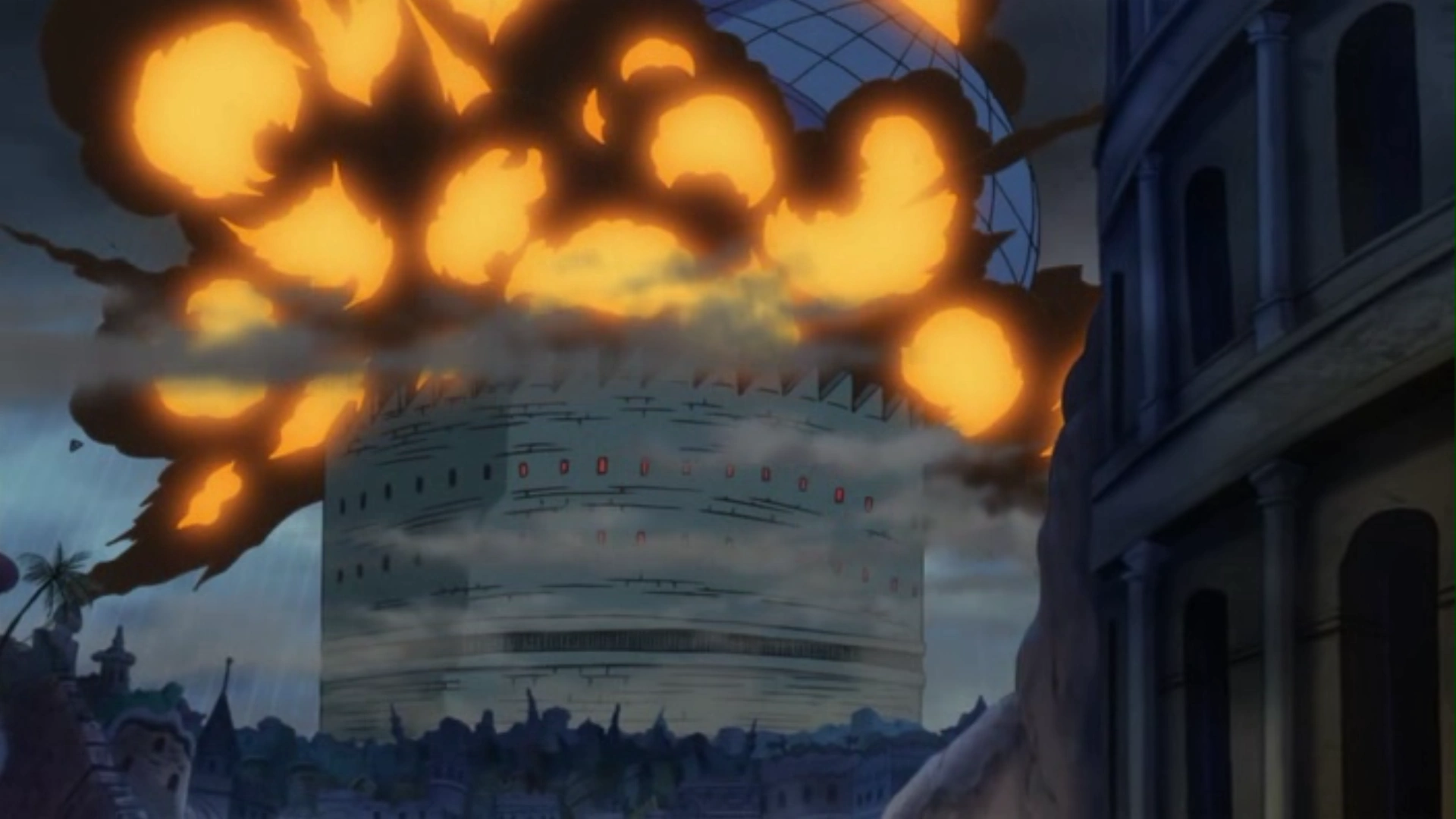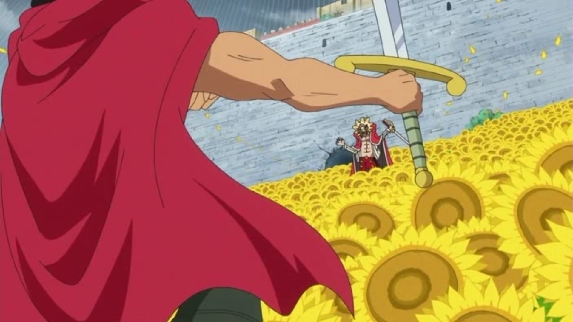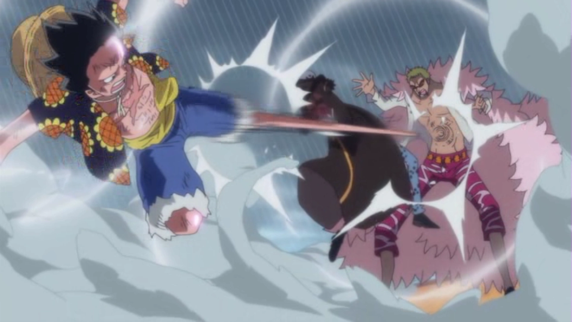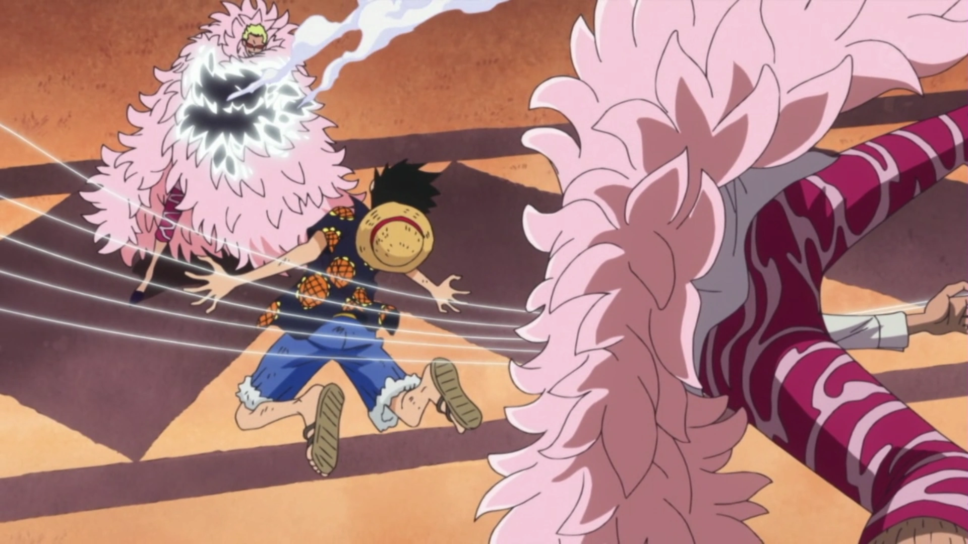 Не вникая в его слова, Кирос вновь нападает на Дофламинго, желая убить его. Однако в момент, когда тот нападает на его тело. Настоящий Дофламинго показывается за спиной гладиатора, после чего решает показать тому, как нужно "головы рубить", после чего в ходе его атаки сносит три башни Королевского Дворца. Тем не менее, благодаря Мугиваре, Кирос остаётся жив, после чего, уйдя от совместной атаки двух Дофламинго, Монки Д. Луффи нападает на его настоящее тело. Но сумев защититься, Дофламинго наносит сильный удар по лицу Луффи, отбрасывая его к стене.[24]