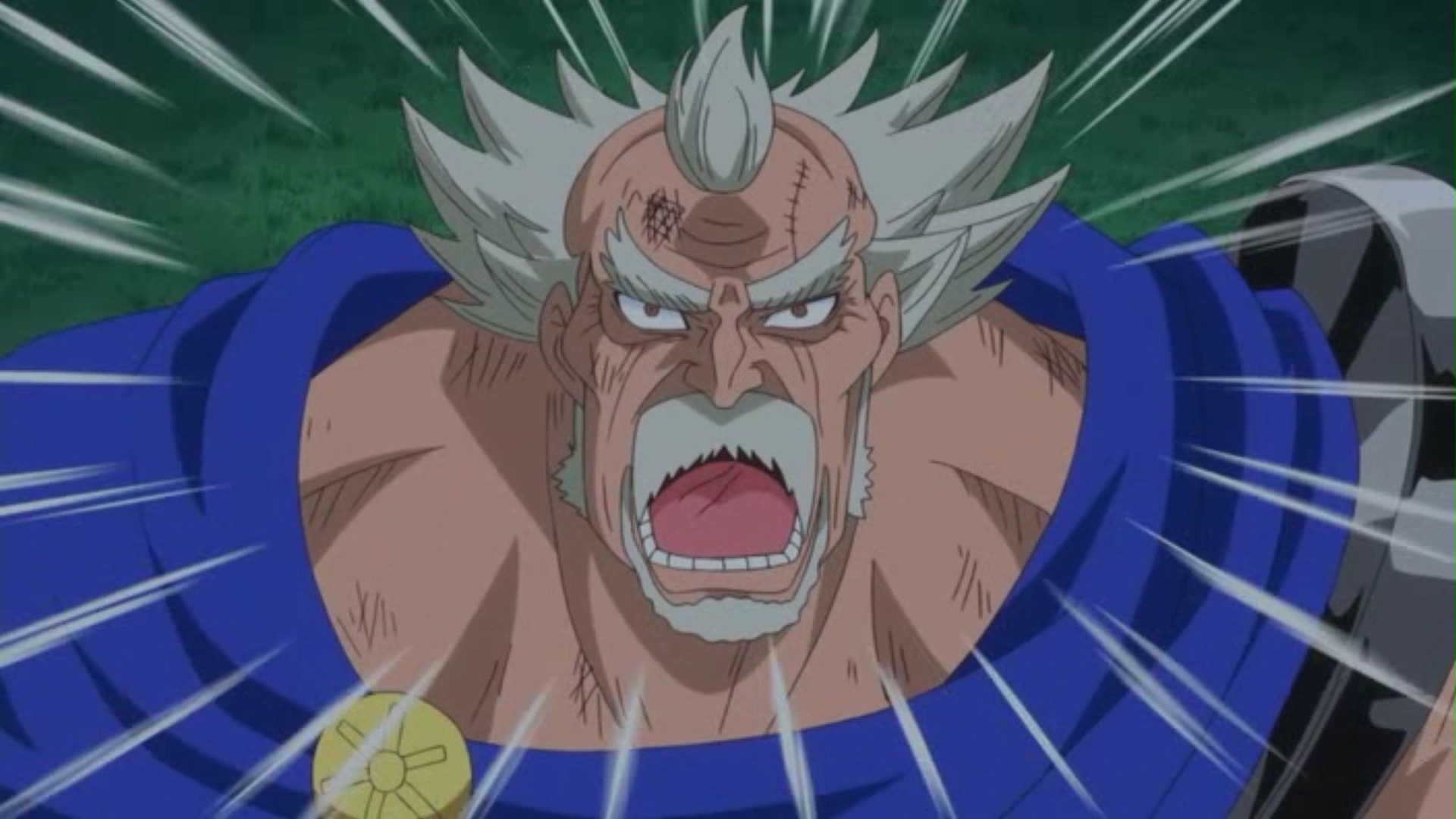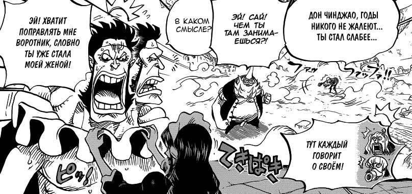Заблудившего в другом месте Кин’эмона, в это время окружает группа агентов Дофламинго, которые признают в нём самурая из-за его причёски. Они просят его пройти с ними и молчать, если он не хочет, чтобы его друг Кандзюро пострадал.[10]