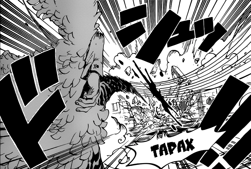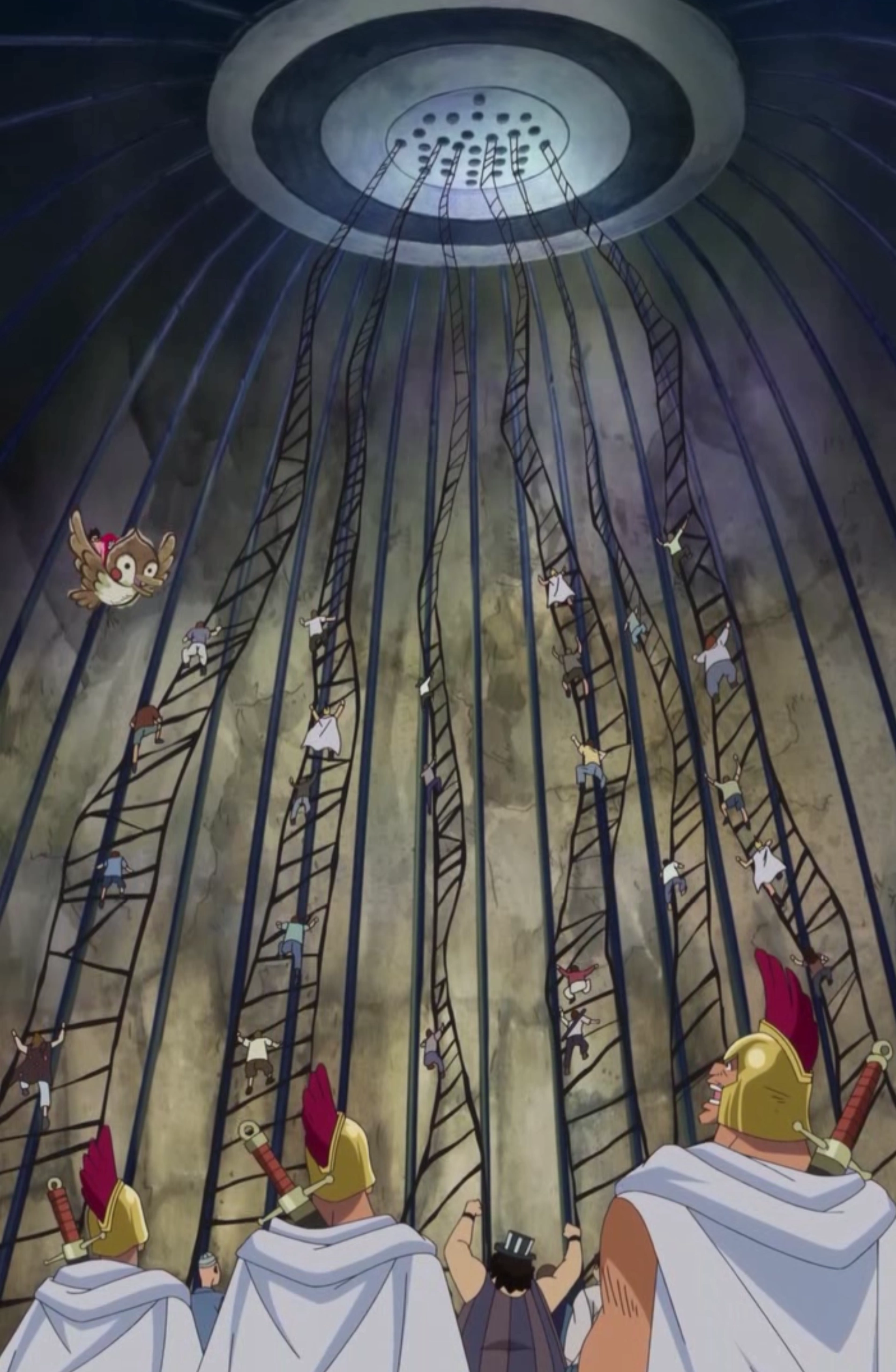 Наблюдая за этим, Луффи, вместе с принцессой Виолой проникают в "Зал Мастей", после чего пытаются освободить Трафальгара Ло от наручников из Кайросэки, в то время как их нагоняет Гладиус. Но прежде чем им удаётся это сделать, в "Зале Мастей" появляется Пика и останавливает их действия. Тогда же, ко всеобщему удивлению, отрубленная голова Дофламинго начинает говорить. Понимая то, что сейчас дело приняло очень скверный оборот, Дофламинго заявляет, что ему придётся использовать "Tori Kago".[23]