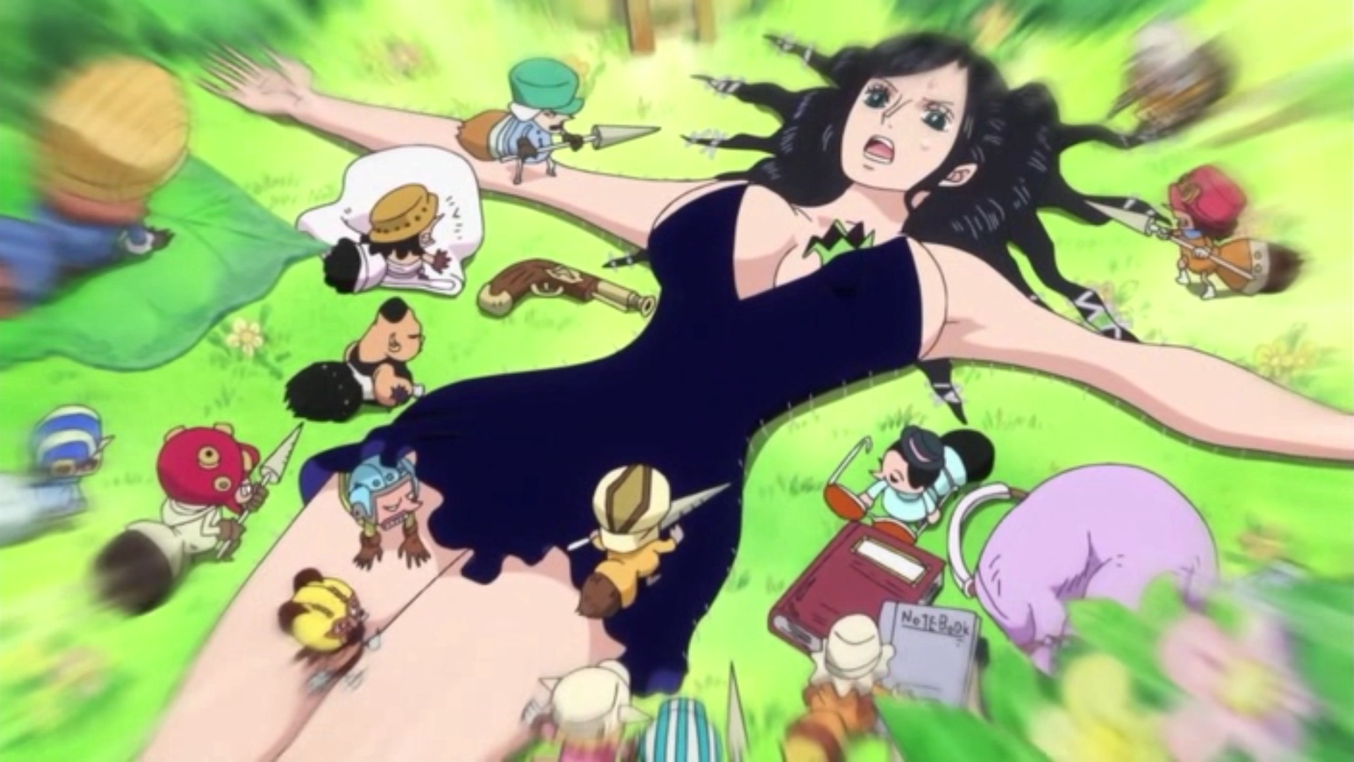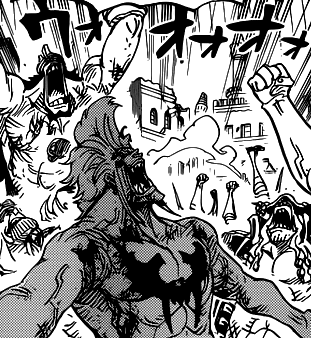 Совершив высадку на остров, Луффи пытается заставить Момоносукэ лететь, чтобы они могли найти фабрику, но Момо не может вспомнить, как он сделал это в первый раз, а также рассказал Луффи, что его отец запретил ему ступать на остров. Луффи начинает драку с Момоносукэ, пока Кин’эмон не успокаивает его. Затем он рассказывает как нужно замаскироваться, чтобы сойти за местных. Ло передаёт Нами Лог Пос на Дзо, на случаи неудачи. Группа передачи Цезаря (Ло, Усопп и Робин) должны пересечь Дресс Розу и попасть на Грин Бит, чтобы передать его, в то время, как некоторые из членов экипажа (Нами, Чоппер, Брук и Момоносукэ) будут следить за кораблем. Однако прежде чем он успел перейти к основной части, он замечает что Луффи, Зоро, Санджи, Фрэнки и Кин’эмон (Команда Уничтожения Фабрики) вдруг исчезли.[2]