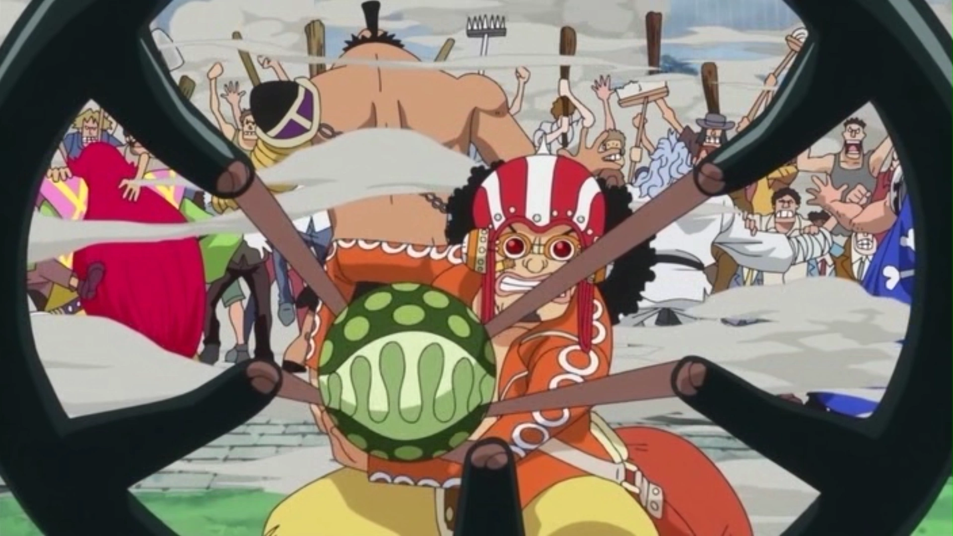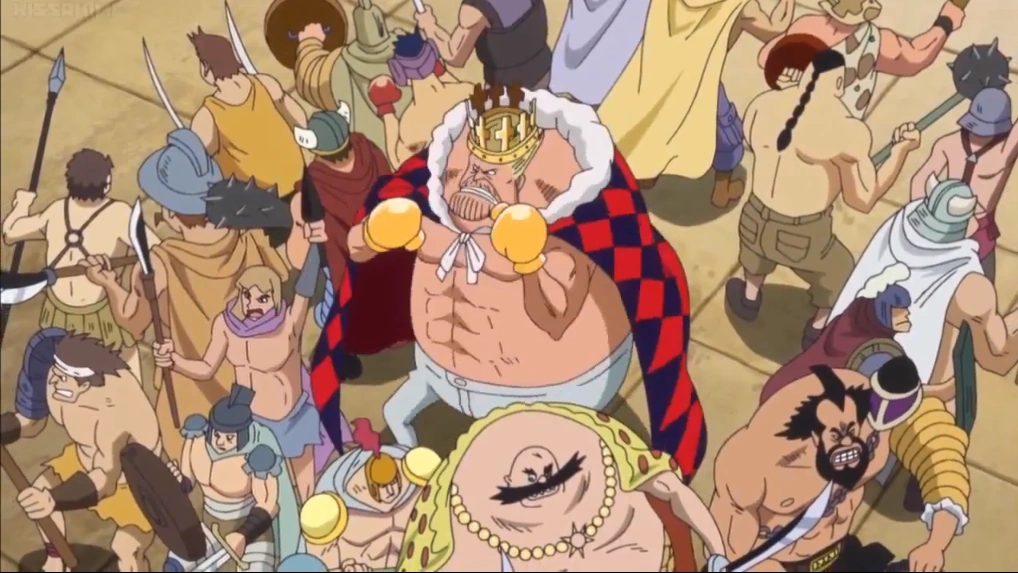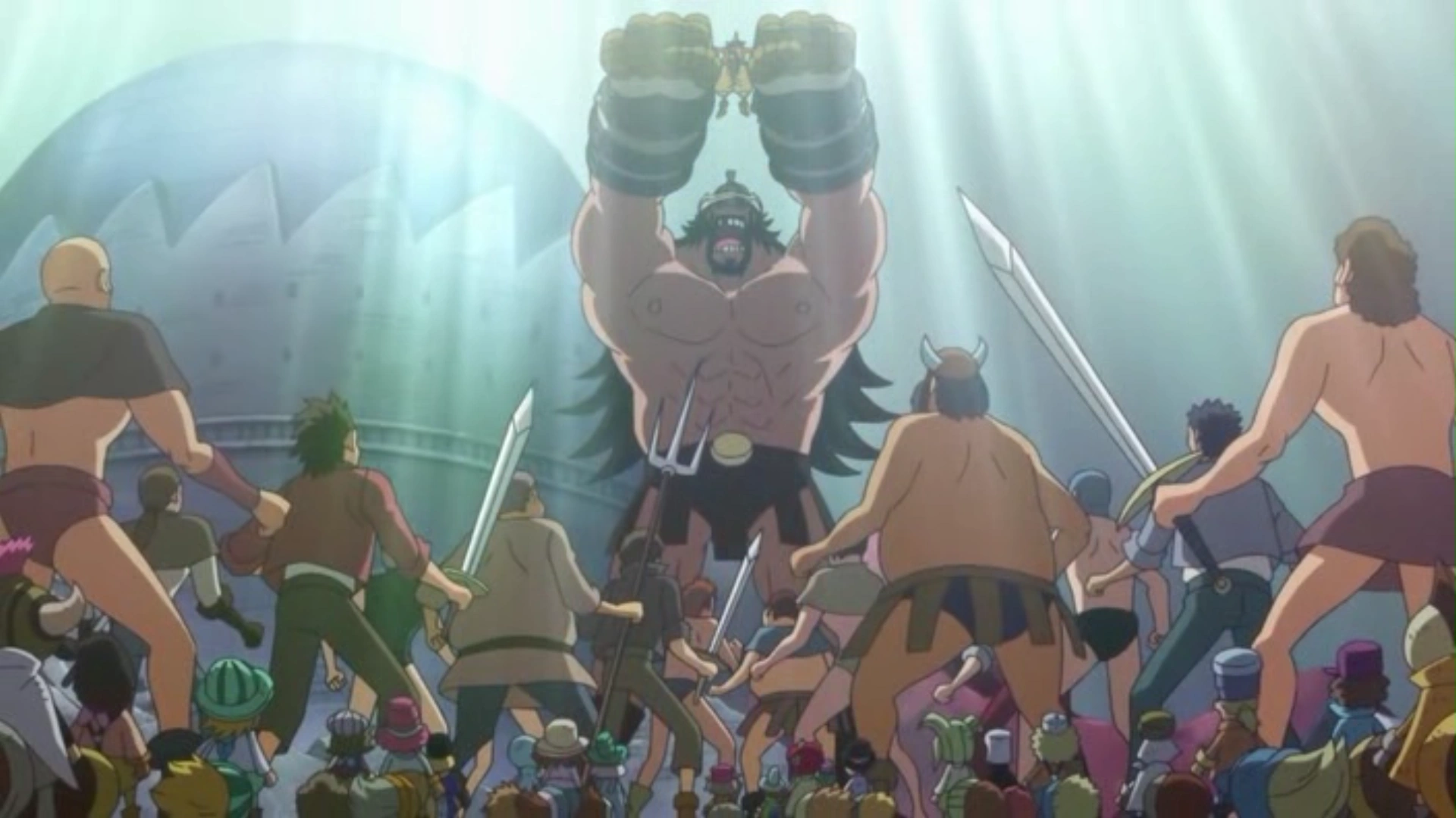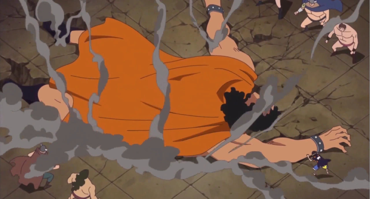 Некоторые из бойцов начинают насмехаться над внешним видом Луффи, из-за его маскировки, считая его слабым. Одним из таких, был Спартан, которого это даже обидело. В следствии он нападает на Луффи, однако тот легко уворачивается, хватает его за руку и впечатывает его в землю, что шокирует всех остальных гладиаторов. Затем Луффи приветствует всех их, как ни в чём не бывало.[6]