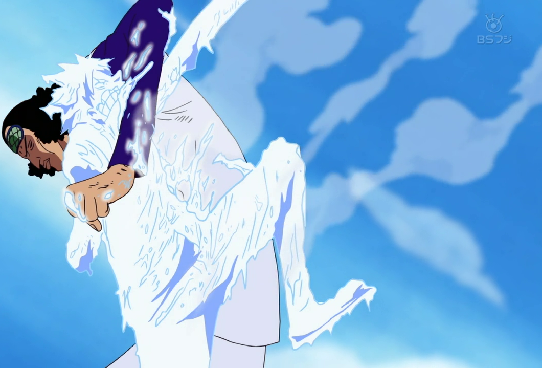 Луффи сражается с Аокидзи, но в конце-концов оказывается полностью заморожен. Аокидзи щадит жизнь Луффи за его победу над Крокодайлом, заявляя, что теперь они в расчете, и размышляет о том, не было ли целью Луффи дать немного времени своему экипажу, или он действительно думал, что он может победить его. Однако, он не преследует Гоинг Мерри, сказав, что команда в любом случае будет уничтожена Робин рано или поздно. Уходя он раздумывает над тем, чтобы передать Луффи сообщение от Смокера, но решает, что это было бы слишком запутанно (И Луффи в замороженном состоянии все равно ничего не услышит). Некоторое время спустя остальные находят Луффи и размораживают его как и Робин. Однако, истощенный событиями Усопп размышляет, не будут ли на их путешествии появляться такие же сильные противники, и говорит, что он не может выдерживать подобные нагрузки дальше, а это значит, что им конец. Зоро говорит, что это не имеет значение, так как, несмотря на поражение, Луффи стал сильнее после боя с Аокидзи. Через три дня экипаж продолжает свое путешествие.