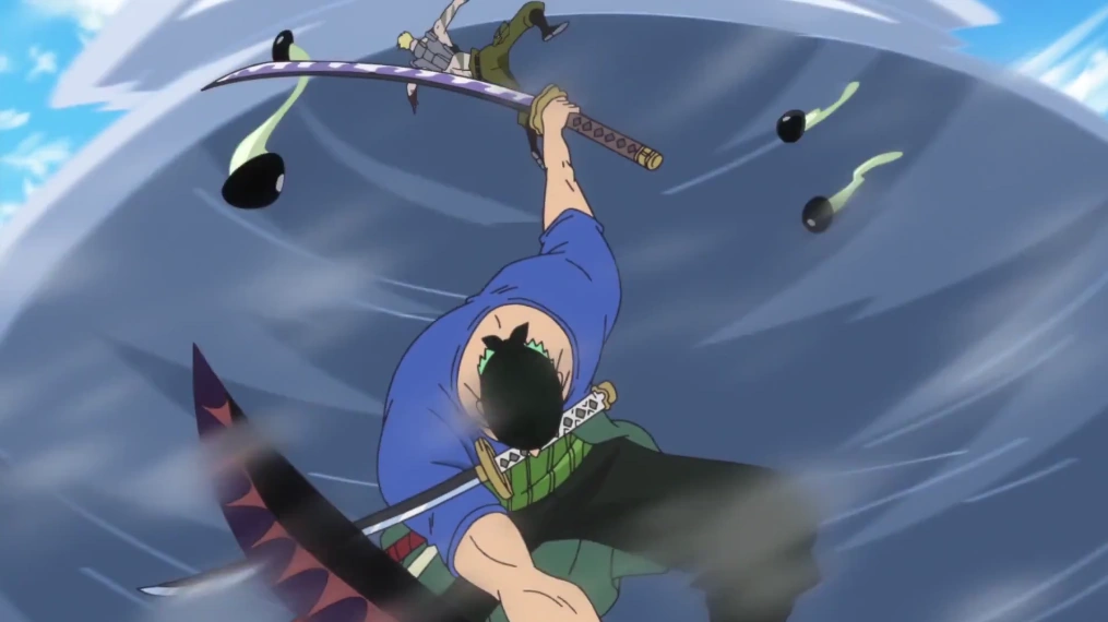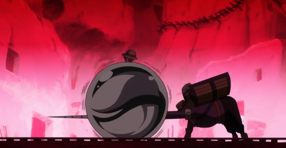 Аберон пронзает шар с Луффи буром, который ему дал Билл