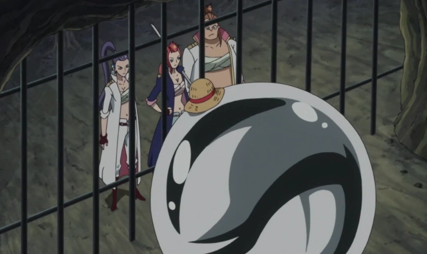 Дезая и её накама стоят около решётки, за которой находится Луффи.